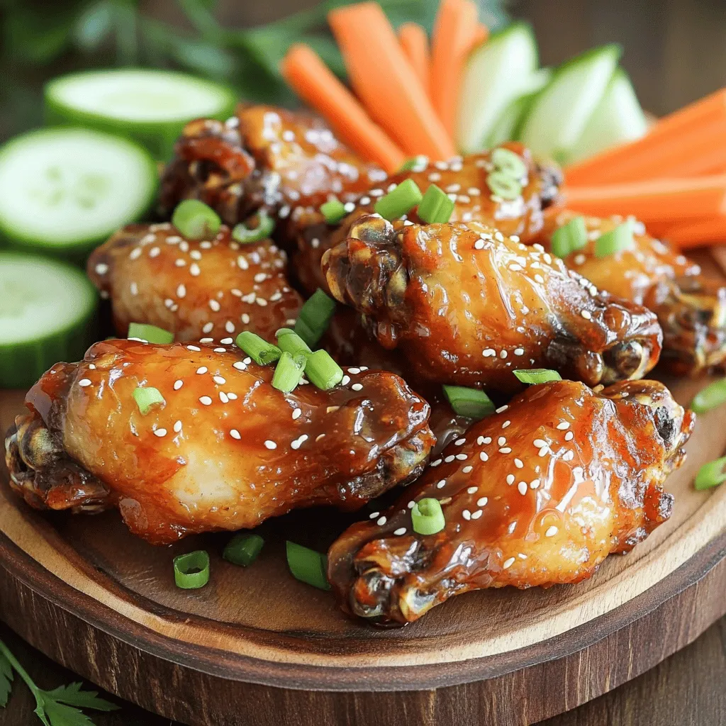 Servieren Sie die Flügel auf einer großen Platte. Streuen Sie Sesamsamen und gehackte Frühlingszwiebeln darüber. Dazu passen geschnittene Gurken und Karottensticks. Diese Beilagen bringen Erfrischung und Crunch.