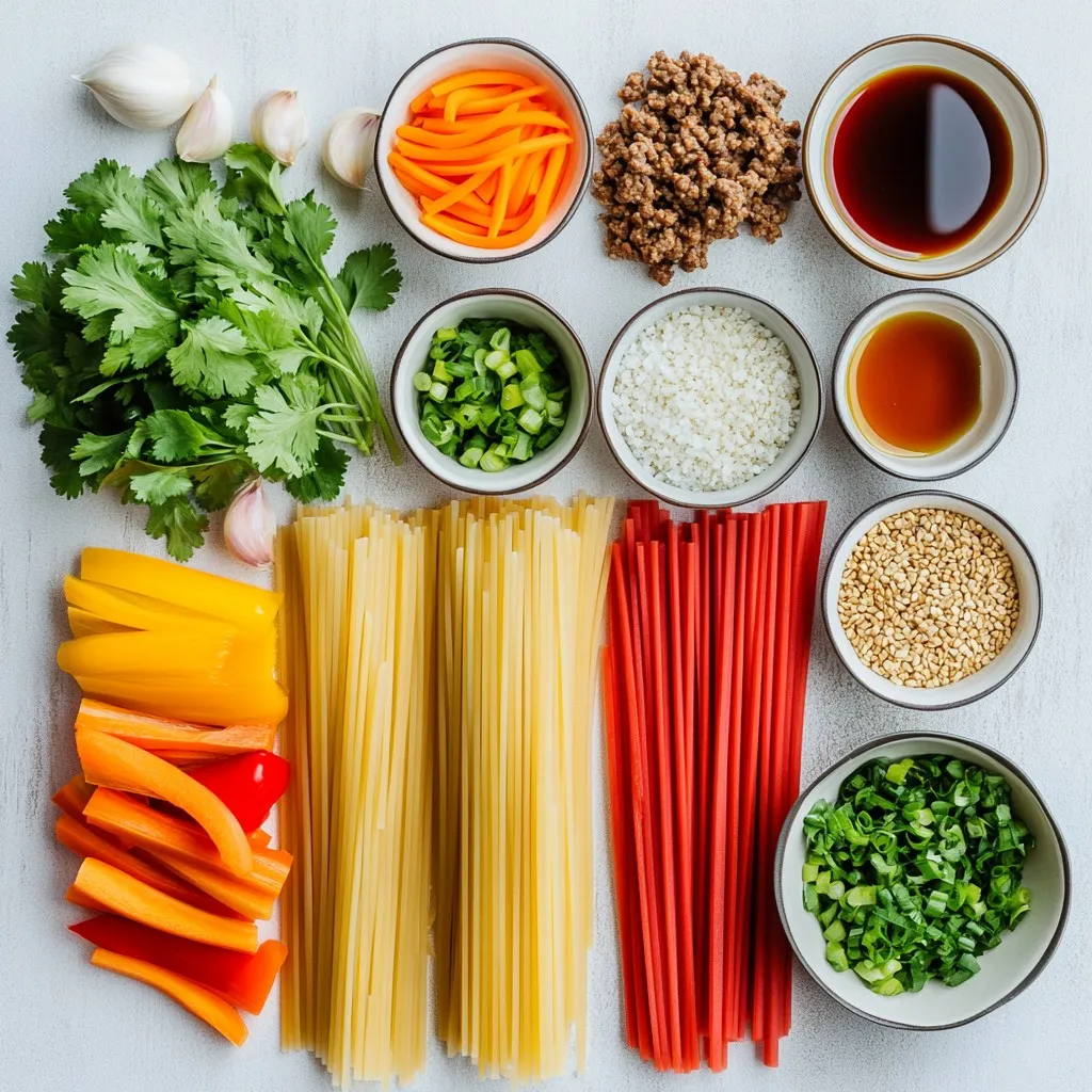 Für diese köstlichen asiatischen Rindfleisch-Spaghetti brauchen Sie einige Hauptzutaten: