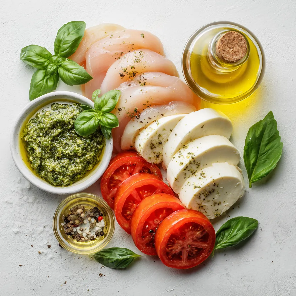 Die Hauptzutaten sind einfach und frisch. Hähnchenbrustfilets sind mager und leicht zuzubereiten. Du kannst Pesto selbst machen oder im Laden kaufen. Frischer Mozzarella bringt einen tollen Geschmack. Tomaten fügen Frische hinzu.