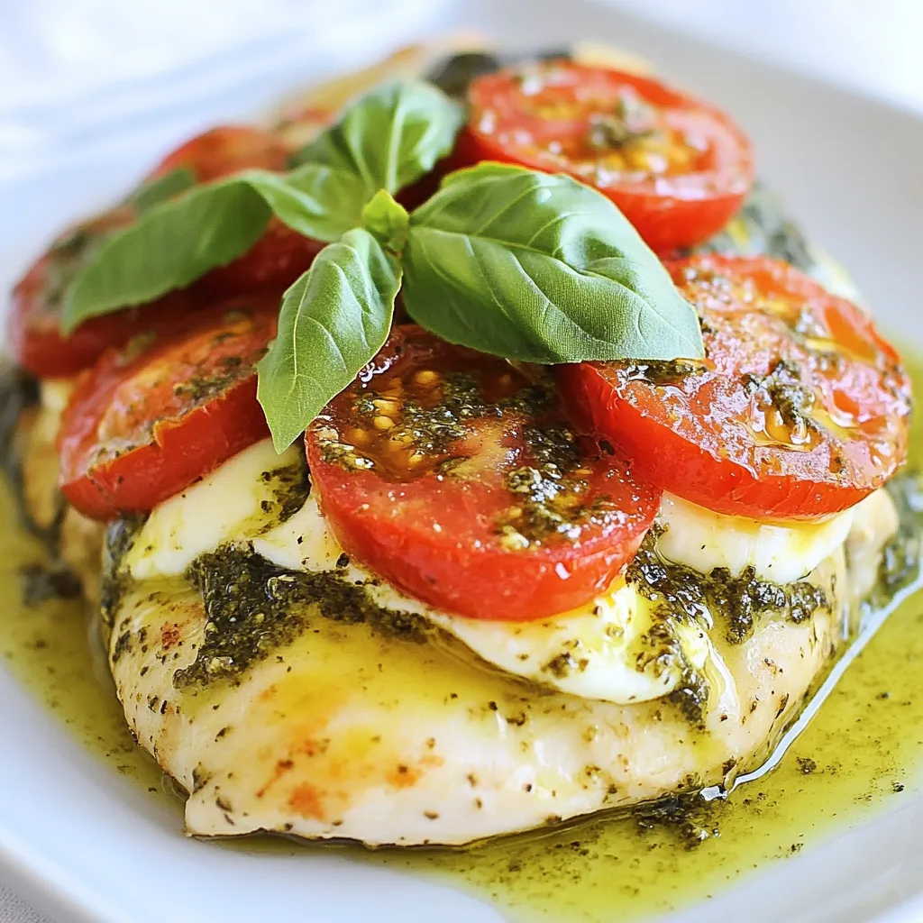 Ein köstliches Hühnchengericht mit Pesto, Mozzarella und Tomaten, perfekt für ein Abendessen.