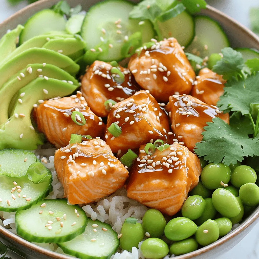 - 450 g Lachsfilet, ohne Haut und gewürfelt - 200 g Jasminreis - 150 g Edamame, geschält Die Hauptzutaten sind wichtig für den Geschmack. Der Lachs ist zart und reich an Nährstoffen. Jasminreis gibt uns eine tolle Basis. Edamame sorgt für einen schönen Biss und ist gesund. - 60 g Mayonnaise - 30 ml süße Chilisauce - 15 ml Sriracha Die Saucen geben den Bowls das besondere Etwas. Die Mayonnaise macht die Sauce cremig. Süße Chilisauce bringt eine angenehme Süße. Sriracha fügt eine leichte Schärfe hinzu, die man nach Geschmack anpassen kann. - 1 Avocado, in Scheiben geschnitten - 1 Gurke, dünn geschnitten - 60 g Frühlingszwiebeln, in Ringe geschnitten Frische Zutaten machen das Gericht bunt und frisch. Die Avocado ist cremig und nährstoffreich. Gurke bringt Frische und Knackigkeit. Frühlingszwiebeln fügen einen milden Zwiebelgeschmack hinzu, der die Bowls perfekt abrundet. - Vorbereitung des Reis: Wasche 200 g Jasminreis unter kaltem Wasser. Spüle, bis das Wasser klar bleibt. - Kochanleitung: Kombiniere den gewaschenen Reis mit 480 ml Wasser in einem Topf. Bringe die Mischung zum Kochen. Reduziere die Hitze, decke den Topf ab und lasse den Reis 15 Minuten köcheln. Nach der Zeit nimm den Topf vom Herd und lasse ihn 5 Minuten abgedeckt ruhen. - Zutaten kombinieren: Mische in einer kleinen Schüssel 60 g Mayonnaise, 30 ml süße Chilisauce, 15 ml Sriracha und 15 ml Sesamöl. - Konsistenz überprüfen: Rühre alles gut um, bis die Sauce cremig und gut vermischt ist. Stelle sie beiseite. - Braten des Lachses: Erhitze einen Schuss Öl in einer beschichteten Pfanne bei mittlerer Hitze. - Würzen und Garzeit: Würze 450 g gewürfelten Lachs mit Salz und Pfeffer. Brate die Würfel 4-5 Minuten, bis sie goldbraun und gar sind. Wende sie gelegentlich. - Anrichten der Schalen: Nimm Schalen und benutze den gekochten Jasminreis als Basis. - Schichten der Zutaten: Füge die Lachswürfel, 150 g geschälte Edamame, Avocadoscheiben, Gurken und Frühlingszwiebeln hinzu. - Sauce auftragen: Beträufle jede Schale großzügig mit der Bang Bang Sauce. - Verteilung der Sauce: Stelle sicher, dass die Sauce gleichmäßig über die Zutaten verteilt ist. - Verwendung von Sesamsamen: Bestreue die Bowls mit Sesamsamen für zusätzlichen Geschmack. - Hinzufügen von frischem Koriander: Füge frischen Koriander hinzu, um das Gericht zu verfeinern und gut auszusehen. - Variieren der Gewürze: Experimentiere mit Gewürzen. Füge etwas Knoblauchpulver oder Paprika hinzu. Diese geben dem Lachs mehr Geschmack. Probiere auch verschiedene Saucen. Eine Erdnusssauce könnte gut passen. - Optimierung der Garzeiten: Achte genau auf die Garzeit des Lachses. Zu viel Hitze macht ihn trocken. Brate den Lachs nur 4-5 Minuten lang. Er sollte innen noch leicht rosa sein. - Vorbereitung der Zutaten im Voraus: Bereite alle Zutaten vor, bevor du kochst. Schneide die Gurke, Avocado und Frühlingszwiebeln im Voraus. So sparst du Zeit beim Kochen. - Tricks für die perfekte Sauce: Probiere, die Sauce vor dem Servieren zu kosten. Füge mehr Sriracha hinzu, wenn du es schärfer magst. Rühre die Sauce gut um, damit sich die Aromen verbinden. - Ansprechende Anordnung: Achte darauf, die Zutaten schön in der Schale anzuordnen. Beginne mit dem Reis als Basis. Lege dann den Lachs, die Edamame und das Gemüse darauf. - Verwendung von bunten Zutaten: Nutze bunte Zutaten für einen tollen Look. Die grüne Avocado und die rote Sauce machen die Schale lebendig. Frischer Koriander bringt zusätzlichen Geschmack und Farbe. {{image_4}} Für eine vegetarische Variante kannst du Tofu anstelle von Lachs verwenden. Tofu hat eine tolle Textur und nimmt den Geschmack gut auf. Du kannst ihn marinieren und braten, genau wie den Lachs. Außerdem kannst du mehr Gemüse hinzufügen. Probiere Zucchini, Paprika oder Brokkoli. Das sorgt für extra Farbe und Nährstoffe in der Schale. Wenn du es würziger magst, kannst du die Sauce anpassen. Füge mehr Sriracha hinzu, um die Schärfe zu erhöhen. Alternativ kannst du verschiedene Saucen ausprobieren. Eine Erdnusssauce oder Teriyaki-Sauce gibt einen neuen Geschmack. Experimentiere mit den Zutaten, um deine perfekte Mischung zu finden. Diese Bowls schmecken toll mit einer Suppe oder einem frischen Salat. Ein leichter Gurkensalat ergänzt die Aromen gut. Du kannst auch zusätzliche Beilagen wie Quinoa oder gebratene Süßkartoffeln servieren. Diese Optionen machen dein Gericht noch vielseitiger und sättigender. - Kühlschranklagerung: Bewahren Sie die Reste in einem luftdichten Behälter auf. So bleibt der Lachs frisch. Stellen Sie sicher, dass die Schalen gut abgedeckt sind. Sie können die Bowls bis zu drei Tage im Kühlschrank lagern. - Haltbarkeit der Zutaten: Geöffnete Saucen sollten ebenfalls im Kühlschrank aufbewahrt werden. Sie halten in der Regel 1 bis 2 Wochen. Frische Zutaten wie Avocado und Gurke sind am besten, wenn Sie sie sofort essen. - Beste Methoden zum Aufwärmen: Den Lachs können Sie in der Mikrowelle bei mittlerer Hitze erwärmen. Achten Sie darauf, ihn nicht zu lange zu erhitzen. Eine andere Möglichkeit ist, ihn in einer Pfanne kurz zu braten. So bleibt der Lachs saftig. - Vermeidung von Überkochen: Beim Aufwärmen sollten Sie die Hitze niedrig halten. Überkochen macht den Lachs trocken. Erhitzen Sie die Bowls nur bis zum warmen Zustand. - Portionierung der Zutaten: Teilen Sie die Zutaten in einzelne Portionen auf. So haben Sie schnell eine gesunde Mahlzeit zur Hand. Verwenden Sie kleine Behälter für die Sauce, um sie frisch zu halten. - Tipps für die langfristige Lagerung: Lagern Sie gekochten Reis im Kühlschrank, aber nicht länger als eine Woche. Für längere Lagerung können Sie den ungenutzten Lachs einfroren. So bleibt er bis zu drei Monate frisch. Gekochter Lachs hält sich gut im Kühlschrank. Bei richtiger Lagerung bleibt er bis zu drei Tage frisch. Bewahren Sie ihn in einem luftdichten Behälter auf. So bleibt der Lachs saftig und lecker. Achten Sie darauf, dass di