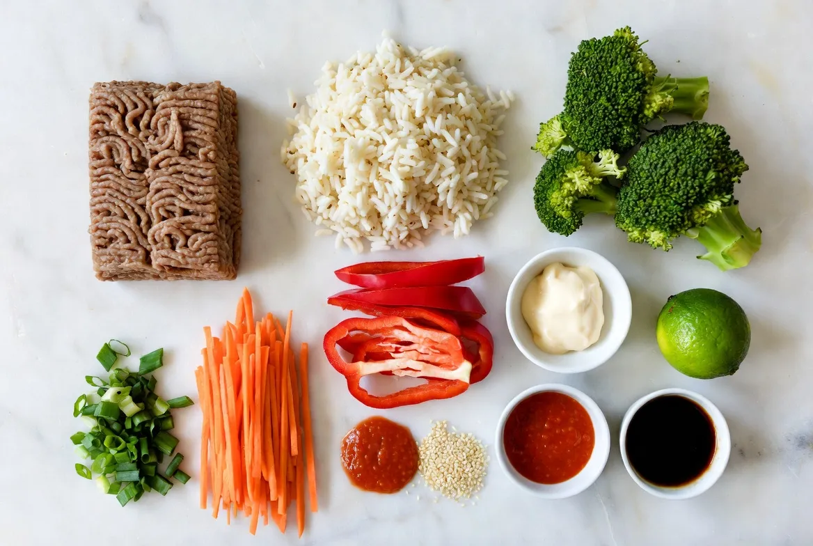 Hauptzutaten für Bang Bang Turkey Rice Bowls