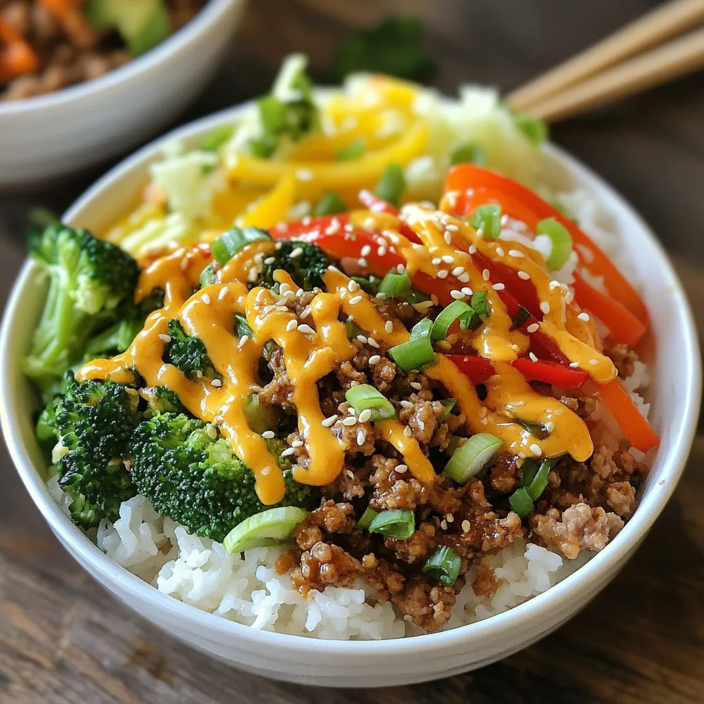 Ein köstliches und würziges Gericht mit gemahlenem Truthahn, Gemüse und einer cremigen Bang Bang Sauce.