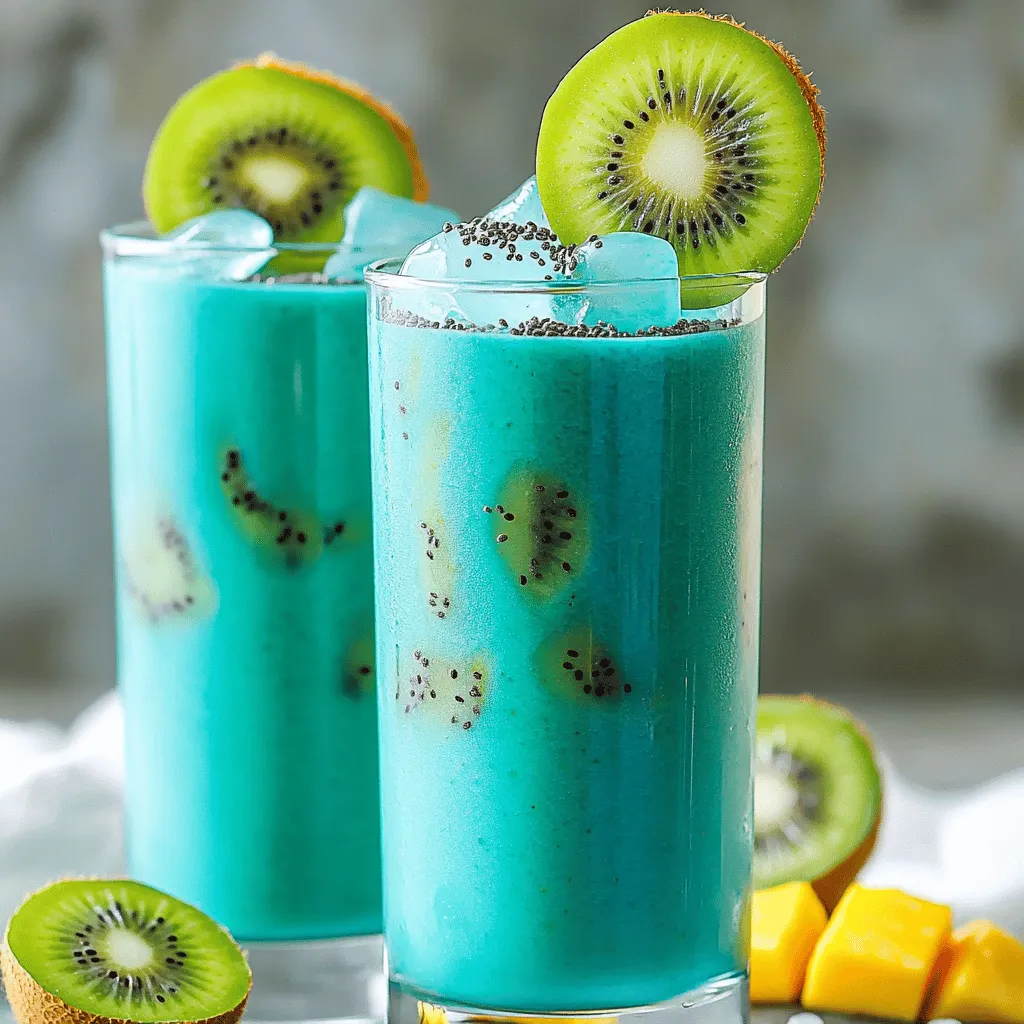 ![- 1 reife Mango, geschält und gewürfelt - 1 reife Kiwi, geschält und in Scheiben geschnitten - 1 Banane, gefroren und in Scheiben geschnitten Die Mango bringt eine süße Note in den Smoothie. Wähle eine reife Mango, die leicht auf Druck gibt. Die Kiwi fügt eine frische, saure Komponente hinzu. Ihre grüne Farbe macht den Smoothie auch schön anzusehen. Die gefrorene Banane sorgt für eine cremige Konsistenz. Sie macht den Smoothie dicker und kälter. - 240 ml Kokosmilch (oder eine beliebige pflanzliche Milch nach Wahl) - 1 Teelöffel blaues Spirulina-Pulver - 1 Esslöffel Chiasamen Kokosmilch ist reichhaltig und cremig. Sie harmoniert gut mit den Früchten. Blaues Spirulina-Pulver gibt dem Smoothie seine auffällige Farbe und viele Nährstoffe. Chiasamen fügen Ballaststoffe und Omega-3-Fettsäuren hinzu. Sie quellen auf und machen den Smoothie noch nahrhafter. - 1 Esslöffel Honig oder Ahornsirup (optional, für zusätzliche Süße) - Eiswürfel (optional, für einen kälteren Smoothie) Wenn du es süßer magst, füge Honig oder Ahornsirup hinzu. Diese Süßungsmittel sind natürlich und lecker. Eiswürfel sind perfekt, wenn du einen erfrischenden Smoothie magst. Sie kühlen und verdünnen den Smoothie leicht. Für das vollständige Rezept, sieh dir bitte die vollständige Anleitung an. Zuerst bereite ich die Zutaten vor. Ich würfle die Mango in kleine Stücke. Die Kiwi schneide ich in dünne Scheiben. Die gefrorene Banane nehme ich aus dem Gefrierfach. Diese Banane macht den Smoothie schön cremig und kalt. Es ist wichtig, die Früchte reif zu wählen. So schmeckt der Smoothie süß und frisch. Jetzt stelle ich den Mixer ein und füge die vorbereiteten Zutaten hinzu. Ich gebe die Mango, Kiwi und die gefrorenen Bananenscheiben in den Mixer. Dann gieße ich die Kokosmilch darüber. Ich füge auch das blaue Spirulina-Pulver und die Chiasamen hinzu. Wenn ich es süßer mag, kommt noch Honig oder Ahornsirup dazu. Ich mixe alles auf hoher Stufe. Es dauert etwa eine Minute. Nach dem Mixen überprüfe ich die Konsistenz. Wenn der Smoothie zu dick ist, füge ich mehr Kokosmilch hinzu. Möchte ich ihn kälter, gebe ich Eiswürfel dazu und mixe nochmals. Ich gieße den Smoothie in hohe Gläser. Das sieht immer toll aus! Für die Präsentation lege ich eine Kiwi-Scheibe am Rand des Glases. Ich streue auch ein paar Chiasamen obenauf. So wird der Smoothie nicht nur lecker, sondern sieht auch super aus. Jetzt kann ich ihn sofort genießen. Für die vollständige Anleitung, schaue dir das Full Recipe an. Um die perfekte Konsistenz für deinen Blue Spirulina Mango Kiwi Smoothie zu finden, musst du die Flüssigkeitsmenge anpassen. Wenn dein Smoothie zu dick ist, füge einfach mehr Kokosmilch hinzu. So wird er cremiger und leichter trinkbar. Du kannst auch Eiswürfel verwenden. Diese machen deinen Smoothie kälter und erfrischender. Füge eine Handvoll Eiswürfel zum Mixer hinzu und mixe sie gut ein. Das gibt deinem Smoothie einen tollen Kick! Experimentiere mit verschiedenen Süßungsmitteln, um den besten Geschmack zu finden. Du kannst Honig oder Ahornsirup verwenden, aber auch Datteln oder Agavendicksaft sind tolle Alternativen. Probiere, was dir am besten schmeckt! Zusätzliche Zutaten wie Spinat oder Haferflocken können mehr Nährstoffe bringen. Diese Zutaten fügen keinen starken Geschmack hinzu, sind aber sehr gesund. Du kannst auch Nüsse oder Samen hinzufügen, um den Smoothie nahrhafter zu machen. Blaues Spirulina hat viele Vorteile. Es ist reich an Antioxidantien und kann das Immunsystem stärken. Außerdem gibt es dir einen schönen Farbton und macht den Smoothie besonders ansprechend. Du kannst auch andere nährstoffreiche Beigaben verwenden. Chiasamen sind eine gute Wahl, da sie Ballaststoffe und Omega-3-Fettsäuren enthalten. Diese Zutaten helfen, deinen Smoothie gesund und lecker zu halten. Denke daran, die richtige Balance zu finden, damit dein Smoothie sowohl gut schmeckt als auch nährstoffreich ist. {{image_4}} Möchten Sie neue Geschmäcker probieren? Verwenden Sie andere tropische Früchte. Ananas oder Papaya passen gut in diesen Smoothie. Sie bringen Süße und einen frischen Geschmack. Kombinieren Sie auch verschiedene Beeren. Himbeeren oder Erdbeeren geben eine schöne Farbe und einen tollen Geschmack. Falls Sie keine Kokosmilch mögen, gibt es viele Optionen. Pflanzenbasierte Milch, wie Mandelmilch oder Hafermilch, sind großartige Alternativen. Sie haben einen milden Geschmack, der gut zu den Früchten passt. Joghurt oder Kefir sind auch gute Ideen. Sie machen den Smoothie cremiger und fügen Probiotika hinzu. Möchten Sie mehr Nährstoffe? Fügen Sie Proteinpulver hinzu. Es gibt viele Sorten, die gut schmecken. Nüsse oder Samen sind auch eine gute Wahl. Mandeln oder Sonnenblumenkerne geben zusätzlichen Crunch. Sie machen den Smoothie nahrhafter und sättigender. Experimentieren Sie mit diesen Zutaten, um Ihre perfekte Mischung zu finden. Für das komplette Rezept schauen Sie bitte hier: [Full Recipe]. Um den Blue Spirulina Mango Kiwi Smoothie frisch zu halten, gibt es einige Tipps. Verwenden Sie reife Früchte, denn sie bieten den besten Geschmack. Lagern Sie den Smoothie in einem luftdichten Behälter. So bleibt er länger frisch. Stellen Sie den Behälter in den Kühlschrank. Dort hält sich der Smoothie bis zu zwei Tage. Achten Sie darauf, ihn gut zu schütteln, bevor Sie ihn genießen. Wenn Sie den Smoothie länger aufbewahren möchten, frieren Sie ihn portionsweise ein. Verwenden Sie Eiswürfelformen oder kleine Behälter. So haben Sie immer eine Portion bereit. Sie können auch die Zutaten vorher einfrieren. Schneiden Sie die Mango, Kiwi und Banane und frieren Sie sie ein. Das macht die Zubereitung zukünftiger Smoothies schnell und einfach. Um die Haltbarkeit zu verlängern, können Sie auf Süßungsmittel achten. Verwenden Sie weniger Honig oder Sirup. Diese können die Frische beeinträchtigen. Wenn Sie den Smoothie nicht sofort trinken, trennen Sie die Fl