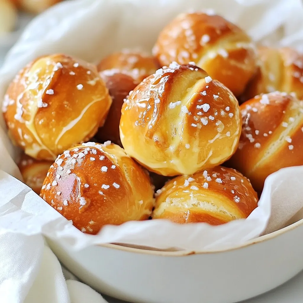 Servieren Sie die warmen Brezelbissen in einem Korb, der mit Backpapier ausgelegt ist. Kombinieren Sie sie mit einer cremigen Käsesauce oder einem würzigen Senf zum Dippen!