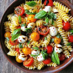 ![Für einen frischen Caprese Pasta Salad benötigen Sie folgende Hauptzutaten: - 225 g Fusilli oder Rotini Pasta - 240 ml Kirschtomaten, halbiert - 240 ml frische Mozzarellakugeln (Bocconcini), halbiert - 120 ml frische Basilikumblätter, grob zerrissen Diese Zutaten bilden die Basis des Salats. Die Pasta sorgt für den herzhaften Teil, während die Tomaten und der Mozzarella den Geschmack abrunden. Basilikum bringt frische Aromen in das Gericht. Die richtigen Gewürze und Öle machen den Salat noch besser. Hier sind die wichtigsten: - 60 ml Balsamico-Glasur - 30 ml Olivenöl - Salz und Pfeffer nach Geschmack - 1/4 Teelöffel zerdrückte rote Pfefferflocken (optional) Balsamico-Glasur und Olivenöl geben dem Salat Tiefe und Geschmack. Die Gewürze sorgen für eine perfekte Balance. Um den Salat noch leckerer zu machen, können Sie folgende optionale Zutaten hinzufügen: - Gegrilltes Gemüse wie Zucchini oder Paprika - Avocado für Cremigkeit - Oliven für mehr Geschmack Diese Zutaten sind nicht nötig, aber sie bringen zusätzliche Texturen und Aromen. Experimentieren Sie und finden Sie Ihre Lieblingskombination! Wenn Sie die vollständige Rezeptanleitung möchten, sehen Sie sich die [Full Recipe] an. Zuerst bringst du in einem großen Topf gesalzenes Wasser zum Kochen. Füge die Fusilli oder Rotini Pasta hinzu. Koche sie nach den Anweisungen auf der Verpackung, bis sie al dente sind. Dies dauert normalerweise etwa 8 bis 10 Minuten. Wenn die Pasta fertig ist, gieße sie ab und spüle sie unter kaltem Wasser ab. So stoppst du den Kochprozess und die Pasta kühlt schnell ab. Während die Pasta abkühlt, wasche die Kirschtomaten und die frischen Basilikumblätter. Halbiere die Kirschtomaten und zerrisse die Basilikumblätter in kleinere Stücke. So geben sie mehr Geschmack ab und sehen schön aus. Nimm eine große Rührschüssel und füge die abgekühlte Pasta hinzu. Gib die halbierten Kirschtomaten, die Mozzarellakugeln und die zerrissenen Basilikumblätter dazu. Träufle das Olivenöl und die Balsamico-Glasur über die Mischung. Streue nach Geschmack Salz, Pfeffer und die zerdrückten roten Pfefferflocken darüber. Mische alle Zutaten vorsichtig. Achte darauf, dass die Pasta gut mit dem Dressing bedeckt ist. Lass den Salat für etwa 30 Minuten im Kühlschrank kühlen. Durch die Kühlung verbinden sich die Aromen gut. Vor dem Servieren, mische den Salat erneut und füge bei Bedarf noch einen Spritzer Balsamico-Glasur hinzu. Serviere ihn in einer großen Schüssel oder auf einem Platter, garniert mit zusätzlichen Basilikumblättern. Diese Schritte machen deinen Caprese Pasta Salad frisch und lecker. Für die vollständige Anleitung, schau dir das [Full Recipe] an. Für deinen Caprese Pasta Salad kannst du verschiedene Pasta verwenden. Fusilli oder Rotini sind ideal, weil sie die Soße gut halten. Du kannst auch Farfalle oder Penne wählen, wenn du etwas anderes möchtest. Achte darauf, die Pasta al dente zu kochen. So bleibt sie bissfest und lecker. Das Dressing macht den Salat besonders. Neben Balsamico-Glasur und Olivenöl kannst du Zitronensaft hinzufügen. Das bringt Frische. Auch Senf oder Honig können dem Dressing Tiefe geben. Experimentiere mit Kräutern wie Oregano oder Thymian für neuen Geschmack. Um Zeit zu sparen, bereite die Zutaten im Voraus vor. Koche die Pasta und schneide das Gemüse, während die Pasta kocht. So bleibt alles frisch und schnell. Ein Tipp: Mische die Zutaten erst kurz vor dem Servieren, damit der Salat knackig bleibt. Wenn du alles gut planst, wird das Kochen zum Vergnügen! {{image_4}} Wenn du deinem Caprese Pasta Salad mehr Protein hinzufügen möchtest, sind Hähnchen und Garnelen tolle Optionen. Du kannst gekochtes Hähnchenbrustfilet oder gebratene Garnelen verwenden. Einfach in Stücke schneiden und hinzufügen, bevor du die anderen Zutaten mischst. Das macht den Salat sättigender und gibt ihm einen herzhaften Geschmack. Für eine vegane Version kannst du die Mozzarella-Kugeln durch pflanzliche Alternativen ersetzen. Es gibt viele Produkte aus Cashew oder Soja, die gut funktionieren. Zusätzlich kannst du Nüsse oder Samen wie Pinienkerne oder Sonnenblumenkerne hinzufügen. Diese bringen einen schönen Crunch und gesunde Fette in den Salat. Um den Geschmack zu intensivieren, füge Avocado oder Oliven hinzu. Avocado macht den Salat cremiger und voller Geschmack. Oliven bieten eine salzige Note und passen gut zu den Tomaten. Du kannst auch geröstete Paprika oder Artischockenherzen hinzufügen. Diese Zutaten bringen mehr Vielfalt und Textur in deinen Salat. Für das volle Rezept schau dir die [Full Recipe] an. Um die Frische der Caprese Pasta Salad zu bewahren, lege ihn in einen luftdichten Behälter. Im Kühlschrank bleibt der Salat bis zu drei Tage frisch. Nach dieser Zeit können die Zutaten ihre Textur ändern. Der Salat könnte auch an Geschmack verlieren. Achte darauf, den Salat vor dem Servieren gut durchzumischen. Du kannst die einzelnen Zutaten im Voraus vorbereiten. Koche die Pasta und lasse sie abkühlen. Halbiere die Kirschtomaten und zupfe die Basilikumblätter. Bewahre alles getrennt im Kühlschrank auf. Mische die Zutaten erst kurz vor dem Servieren, um die Frische zu erhalten. So sparst du Zeit und der Salat bleibt knackig. Falls du Reste hast, verwandle sie in eine neue Mahlzeit. Füge zum Beispiel gegrilltes Hähnchen oder Garnelen hinzu, um mehr Protein zu bekommen. Du kannst auch Tortilla-Wraps verwenden, um einen leckeren Wrap zu machen. Ein wenig frischer Spinat oder Rucola bringt zusätzlichen Geschmack. Experimentiere mit deinen Resten und genieße neue Gerichte! Ja, du kannst die Pasta aufbewahren. Koche die Pasta und lasse sie abkühlen. Bewahre sie in einem luftdichten Behälter auf. Die Pasta bleibt so frisch für bis zu drei Tage. Achte darauf, dass du sie gut abdeckst, um ein Austrocknen zu vermeiden. Der Caprese Pasta Salad hält sich im Kühlschrank etwa drei bis fünf Tage. Stelle sicher, dass der Salat gut abgedeckt 