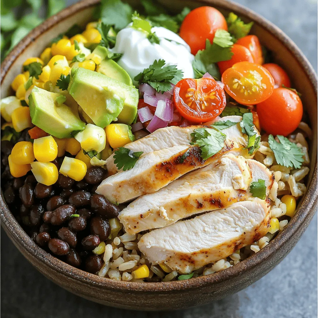 – Schichten der Zutaten in der Schale: Beginne mit einer Basis aus braunem Reis. Füge schwarze Bohnen und Mais hinzu. Schneide das Hähnchen in Stücke und lege es darauf. Garniere mit Avocado, Kirschtomaten und roten Zwiebeln.