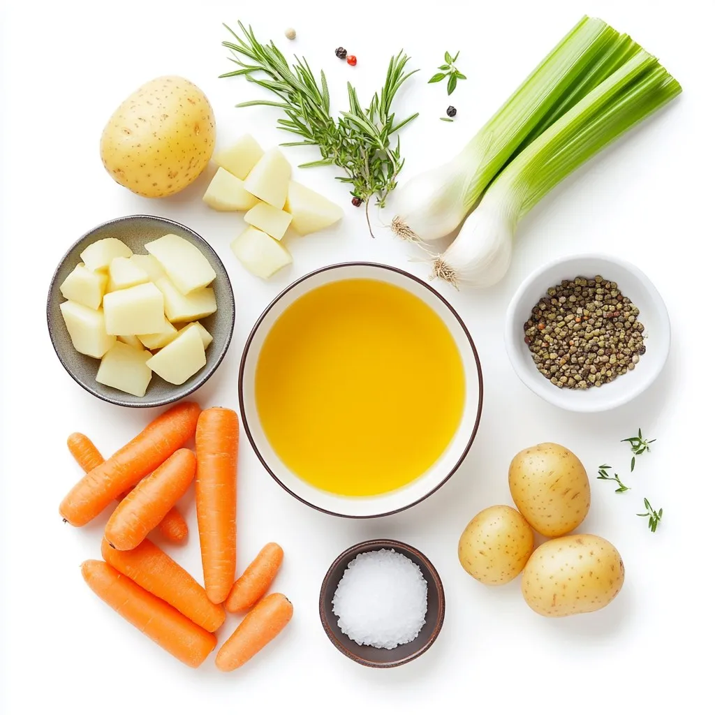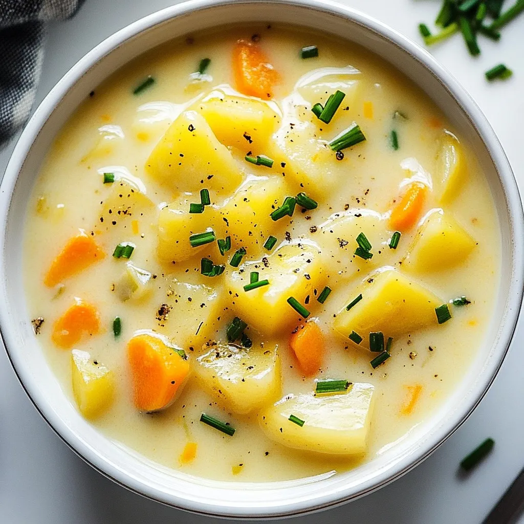 Kartoffeln sind der Star der Suppe. Sie machen sie cremig und nahrhaft. Zwiebeln und Knoblauch geben Geschmack. Karotten und Sellerie fügen Farbe und Süße hinzu. Gemüsebrühe bringt alles zusammen.