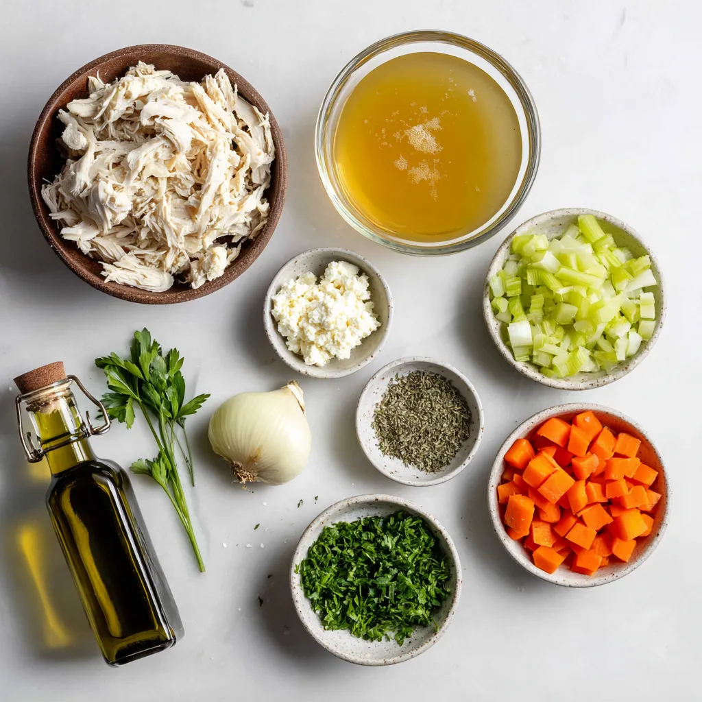 Hauptzutaten für die Hüttenkäse-Hühnchensuppe