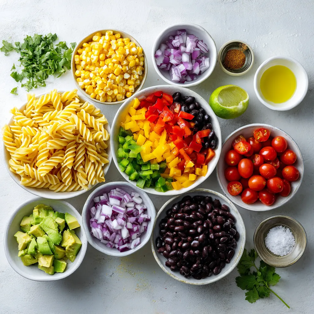 Nehme eine große Schüssel für die Salatzutaten. Füge die abgekühlten Rotini-Nudeln hinzu. Dann kommen die schwarzen Bohnen, die abgetropft sind, und der Mais, frisch oder aus der Dose. Würfle die rote und grüne Paprika und gib sie dazu. Hacke die rote Zwiebel fein und füge sie hinzu. Halbiere die Cherrytomaten und mische sie unter. Zum Schluss kommt die gewürfelte Avocado und der grob gehackte Koriander. Mische alles vorsichtig, damit die Avocado nicht zerdrückt wird.