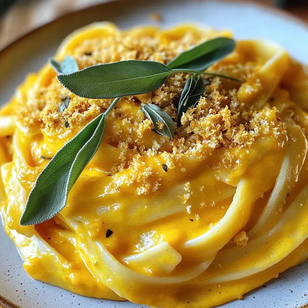 Richten Sie die cremige Kürbis-Alfredo-Pasta auf Tellern an. Toppen Sie die Pasta großzügig mit den knusprigen Salbeibröseln. Diese geben zusätzlichen Crunch und Geschmack. Genießen Sie Ihr köstliches Gericht!