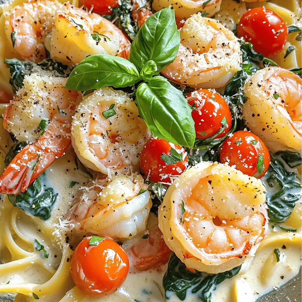In derselben Pfanne kommen die halbierten Kirschtomaten hinzu. Koche sie für 2-3 Minuten, bis sie weich sind. Gieße die Sahne in die Pfanne und bringe alles zum sanften Köcheln. Rühre den geriebenen Parmesan ein, bis er schmilzt und die Sauce glatt ist. Füge den gehackten Spinat hinzu und lasse ihn 1-2 Minuten welken. Jetzt gib die Garnelen zurück in die Pfanne und rühre alles gut um. Lass das Gericht 2 Minuten zusammen köcheln. Schmecke es ab und passe die Würze nach Bedarf an.