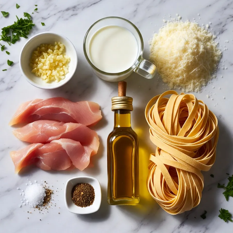 Hauptzutaten für die cremige Hähnchen Alfredo Pfanne