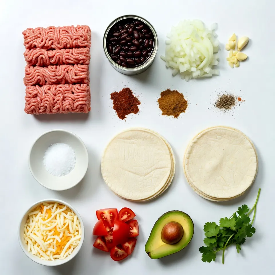 Um diese Tacos zuzubereiten, brauchst du einige Hauptzutaten. Zuerst nimmst du 450 g gemahlenes Putenfleisch. Diese Zutat macht die Tacos saftig und voll. Dann kommt die Dose schwarze Bohnen. Sie sind nahrhaft und geben einen tollen Geschmack. Du brauchst auch 12 kleine Maistortillas. Diese sind perfekt, um die Mischung zu umhüllen.