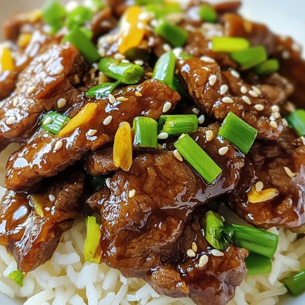 Servieren Sie das Crispy Mongolian Beef auf einem Bett aus gedämpftem Jasminreis und garnieren Sie mit geschnittenen Frühlingszwiebeln und Sesamsamen.