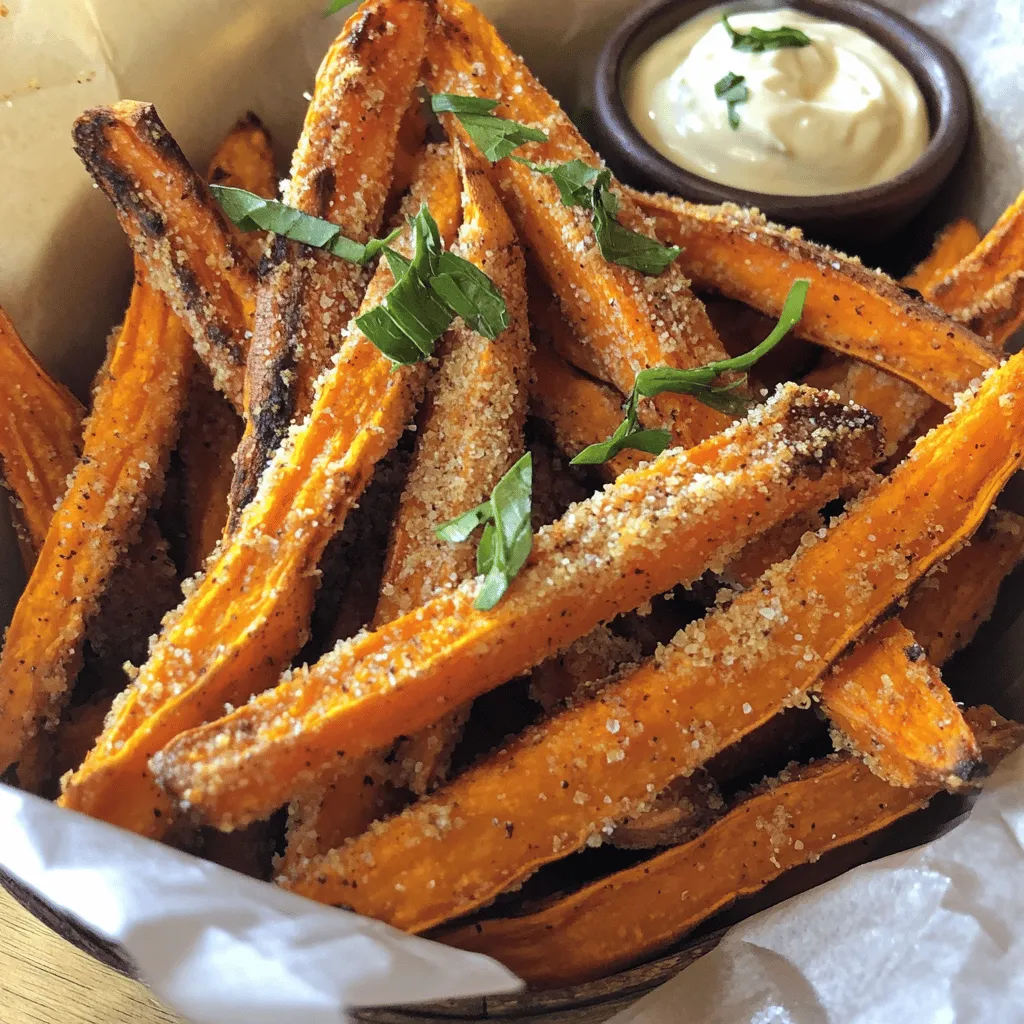 ![- 2 große Süßkartoffeln - 2 Esslöffel Olivenöl - Gewürze: - 1 Teelöffel Maisstärke - 1 Teelöffel Knoblauchpulver - 1 Teelöffel Paprika - 1/2 Teelöffel schwarzer Pfeffer - 1/2 Teelöffel Salz Die Hauptzutaten sind einfach und leicht zu finden. Süßkartoffeln sind der Star des Gerichts. Sie sind süß und gesund. Olivenöl sorgt für eine goldene Farbe und einen tollen Geschmack. Gewürze bringen das Gericht zum Leben. Maisstärke macht die Pommes besonders knusprig. Knoblauchpulver und Paprika geben einen feinen Aroma-Kick. Pfeffer und Salz runden alles ab. - Frische Kräuter: Petersilie, Koriander - Dipsaucen: würzige Mayonnaise oder Knoblauch-Aioli Frische Kräuter sind eine tolle Ergänzung. Sie bringen Farbe und Geschmack. Petersilie gibt Frische, während Koriander einen besonderen Touch hat. Dipsaucen sind ebenfalls wichtig. Sie machen die Pommes noch leckerer. Probiere verschiedene Dips aus, um dein Erlebnis zu erweitern. Die Kombination aus Süßkartoffeln und Dips wird jeden beeindrucken. Du kannst die Grundrezeptur leicht anpassen, um neue Geschmäcker zu entdecken. Zuerst schälen Sie die Süßkartoffeln. Verwenden Sie einen einfachen Schäler. Dann schneiden Sie die Süßkartoffeln in dünne Stäbchen. Dünne Stäbchen sorgen für mehr Knusprigkeit. Legen Sie die Stäbchen für etwa 30 Minuten in kaltes Wasser. Dies hilft, die Stärke zu entfernen. Weniger Stärke bedeutet knusprigere Pommes. In einer großen Schüssel vermengen Sie die Süßkartoffelstäbchen mit Olivenöl. Fügen Sie Maisstärke, Knoblauchpulver, Paprika, Pfeffer und Salz hinzu. Mischen Sie alles gut durch. Achten Sie darauf, dass jedes Stück gleichmäßig beschichtet ist. Dies sorgt für einen gleichmäßigen Geschmack. Heizen Sie den Ofen auf 220°C vor. Legen Sie ein Backblech mit Backpapier aus. Verteilen Sie die Pommes in einer einzigen Schicht. Überfüllung führt zu weniger Knusprigkeit. Backen Sie die Pommes für 25 bis 30 Minuten. Wenden Sie sie nach der Hälfte der Zeit. Behalten Sie die Pommes im Auge, um sicherzustellen, dass sie nicht verbrennen. Wenn sie goldbraun sind, nehmen Sie sie heraus. Lassen Sie die Pommes kurz abkühlen, bevor Sie sie servieren. Für die vollständige Anleitung und alle Details schauen Sie sich das Full Recipe an. Um die Süßkartoffel-Pommes knusprig zu machen, gibt es ein paar wichtige Schritte. Zuerst solltest du die Süßkartoffeln in kaltem Wasser einweichen. Dies hilft, die Stärke zu entfernen. Weniger Stärke bedeutet mehr Knusprigkeit. Ich empfehle, die Süßkartoffeln mindestens 30 Minuten im Wasser zu lassen. Nach dem Einweichen ist es wichtig, die Pommes gut zu trocknen. Nimm ein Küchentuch und tupfe sie ab. Feuchtigkeit kann die Knusprigkeit beeinträchtigen. Wenn du die Pommes trocken machst, wird das Ergebnis viel besser. Die Gewürze machen den Unterschied. Du kannst verschiedene Kombinationen ausprobieren. Zum Beispiel, füge etwas Cayennepfeffer für Schärfe hinzu. Wenn du es lieber mild magst, bleibt bei Knoblauchpulver und Paprika. Die Menge der Gewürze kannst du nach deinem Geschmack anpassen. Beginne mit den angegebenen Mengen und ändere sie nach Bedarf. Manchmal mag ich es, mehr Paprika für den Raucharoma zu verwenden. Experimentiere und finde deine perfekte Mischung. Die Präsentation ist wichtig, um die Pommes appetitlich aussehen zu lassen. Serviere sie in einem rustikalen Korb oder auf einem weißen Teller. Das macht das Gericht ansprechender. Zusätzlich empfehle ich, Dipsaucen dazu zu reichen. Eine würzige Mayonnaise oder ein selbstgemachter Knoblauch-Aioli passt perfekt zu den Pommes. So hast du nicht nur einen tollen Geschmack, sondern auch eine schöne Optik. {{image_4}} Möchtest du deine Süßkartoffel-Pommes schärfer machen? Füge einfach Cayennepfeffer hinzu. Ein kleiner Löffel reicht oft aus. Du kannst auch eine Mischung aus verschiedenen scharfen Gewürzen verwenden. Paprika, Kreuzkümmel und Chili sorgen für einen tollen Kick. Diese Variationen machen die Pommes aufregend und lecker. Wenn du Käse magst, probiere überbackene Süßkartoffel-Pommes. Streue deinen Lieblingskäse über die Pommes vor dem Backen. Cheddar oder Parmesan sind perfekt. Du kannst auch andere Gemüse wie Paprika oder Zucchini hinzufügen. Das gibt extra Geschmack und Farbe. Für eine vegane Version ersetze das Olivenöl mit einer pflanzlichen Alternative. Du kannst auch Gewürze wie Hefeflocken verwenden, um den Käsegeschmack zu imitieren. Wenn du Allergien hast, achte darauf, glutenfreie Zutaten zu verwenden. Diese Anpassungen machen das Gericht für alle zugänglich. Für das vollständige Rezept siehe [Full Recipe]. Um deine krossen Süßkartoffelpommes frisch zu halten, kühle sie richtig. Lass die Pommes zuerst vollständig abkühlen. Danach lege sie in einen luftdichten Behälter. So bleiben sie knusprig und frisch. Du kannst sie auch einfrieren. Lege sie dafür in einen gefrierfesten Beutel. Vergiss nicht, die Luft herauszudrücken, bevor du ihn verschließt. Behälterempfehlungen: - Luftdichter Behälter - Gefrierbeutel für das Einfrieren - Papiertücher, um Feuchtigkeit zu absorbieren Wenn du die Pommes erneut genießen willst, mache sie wieder knusprig. Der Ofen ist dafür der beste Weg. Heize ihn auf 200°C vor. Lege die Pommes auf ein Backblech und backe sie für etwa 10 Minuten. So werden sie kross und lecker. Mikrowelle ist eine schnelle Option, aber sie macht die Pommes weich. Wenn du keine Zeit hast, ist die Mikrowelle in Ordnung. Für den besten Geschmack empfehle ich jedoch den Ofen. Die Zubereitung von Süßkartoffel-Pommes dauert etwa 1 Stunde. Du benötigst 10 Minuten für die Vorbereitung und 25-30 Minuten zum Backen. Es ist wichtig, die Süßkartoffeln zuerst in kaltem Wasser einzuweichen. So entfernen wir überschüssige Stärke. Diese Technik hilft, die Pommes knusprig zu machen. Häufige Fehler sind zu viel Feuchtigkeit und Überfüllung des Backblechs. Achte darauf, die Süßkartoffeln gut abzutrocknen,