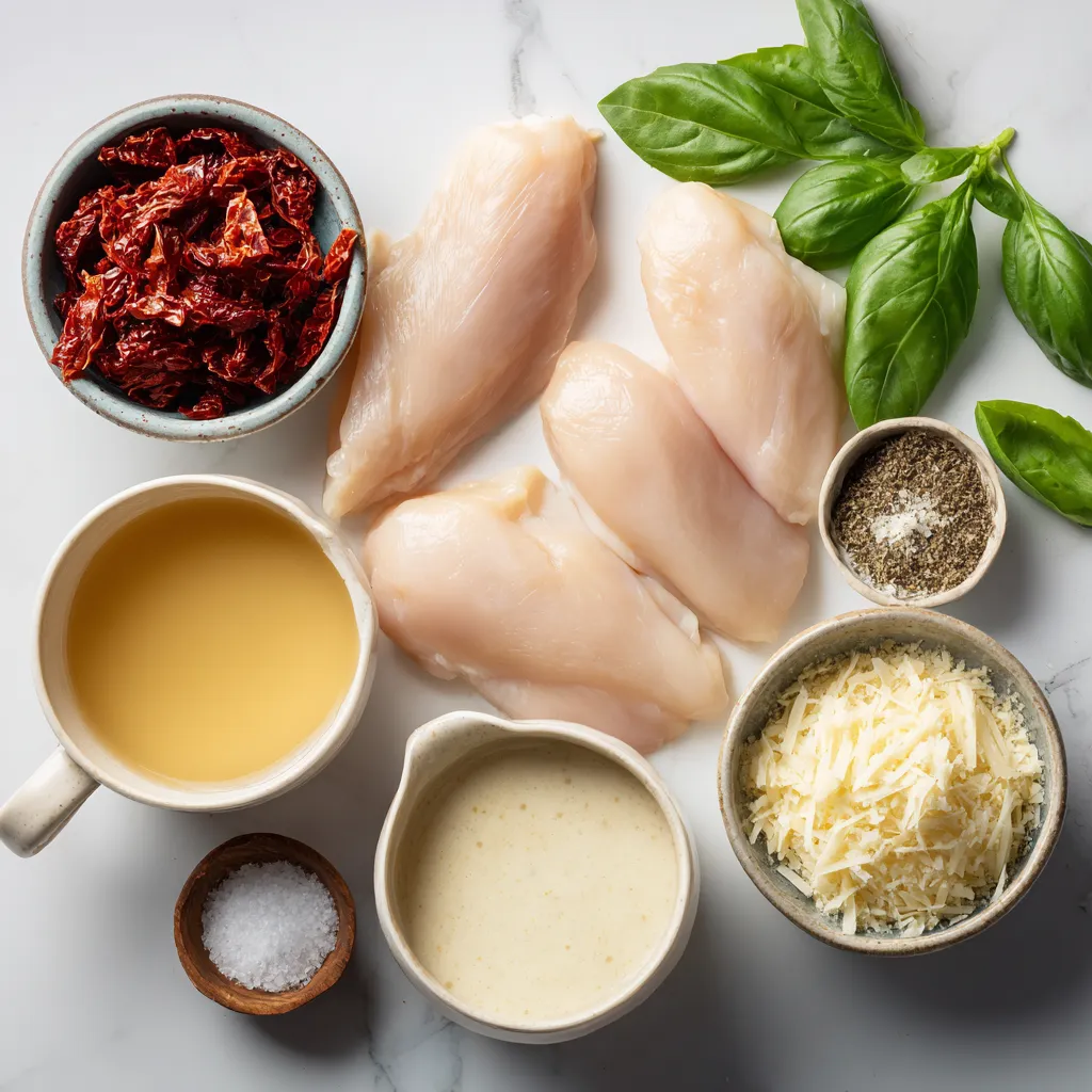 Die Hauptzutaten sind einfach zu finden und sehr lecker. Hähnchenbrustfilets sind zart und saftig. Getrocknete Tomaten bringen einen tollen Geschmack. Die Sahne macht alles schön cremig.