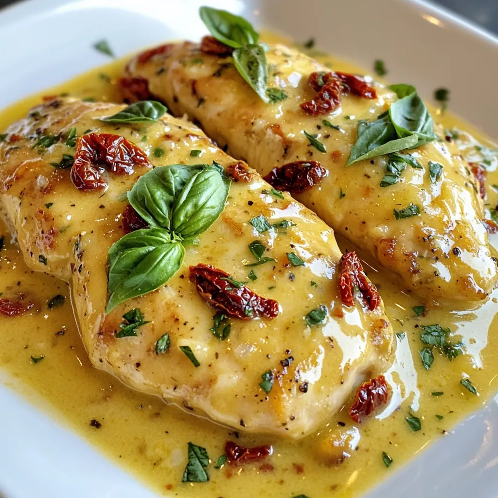 Gieß die cremige Tomatensauce über die Hähnchenbrustfilets, sodass sie vollständig bedeckt sind.