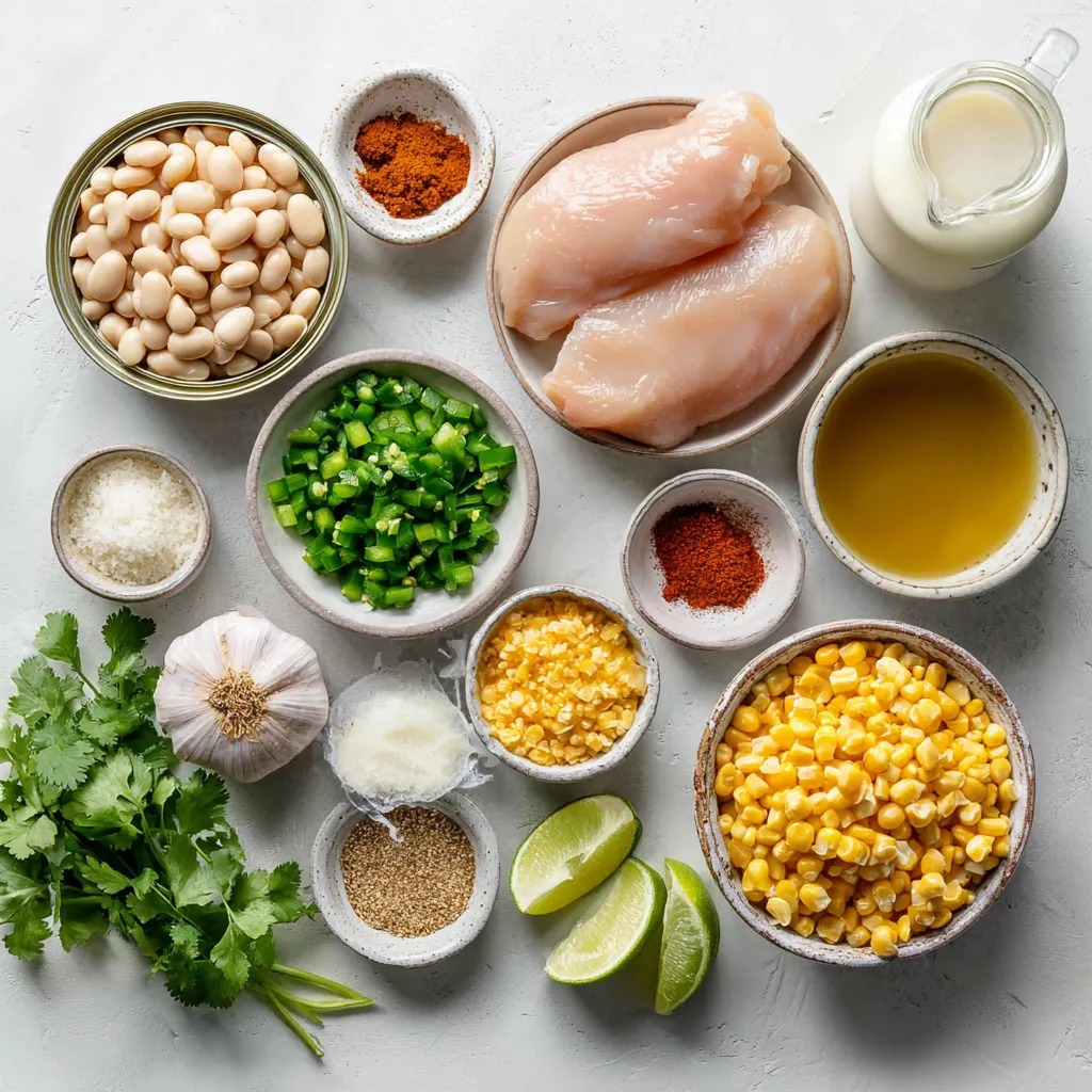 Im Crockpot schichten: Legen Sie die Hähnchenbrustfilets auf den Boden des Crockpots. Darauf fügen Sie die abgetropften weißen Bohnen, die gewürfelten grünen Chilischoten, die gewürfelte Zwiebel, den gehackten Knoblauch, den Mais sowie die Gewürze (Kreuzkümmel, Chilipulver und geräuchertes Paprikapulver) hinzu.