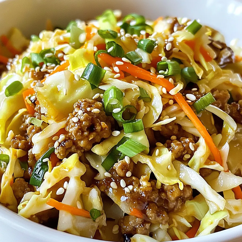 - 450 g gemahlenes Truthahn- oder Hähnchenfleisch - 4 Tassen Krautsalatmix (geschredderter Kohl und Karotten) - 3 Frühlingszwiebeln, gehackt - 2 Knoblauchzehen, fein gehackt - 1 Esslöffel frischer Ingwer, gerieben Diese Zutaten bilden die Basis für den köstlichen Egg Roll in a Bowl. Das gemahlene Fleisch gibt dem Gericht einen herzhaften Geschmack. Der Krautsalatmix bringt Knackigkeit und Frische. Frühlingszwiebeln und Knoblauch fügen ein tolles Aroma hinzu. - 60 ml natriumarme Sojasauce - 1 Esslöffel Sesamöl - 1 Esslöffel Reisessig - 1 Teelöffel Sriracha (optional, für Schärfe) Die Gewürze sind wichtig. Sojasauce sorgt für Umami. Sesamöl bringt einen nussigen Geschmack. Reisessig fügt eine feine Säure hinzu. Wenn du es scharf magst, ist Sriracha ein toller Zusatz. - Sesamkörner - Salz und Pfeffer nach Geschmack Garnierungen machen dein Gericht besonders. Sesamkörner geben einen schönen Crunch. Salz und Pfeffer runden den Geschmack ab. Du kannst die Garnituren nach deinem Geschmack anpassen. - Erhitze das Sesamöl in einer großen Pfanne bei mittlerer Hitze. - Zerhacke zwei Knoblauchzehen fein. Reibe einen Esslöffel frischen Ingwer. - Brate das gemahlene Truthahn- oder Hähnchenfleisch in der Pfanne an. - Rühre das Fleisch ständig, bis es gleichmäßig gebräunt ist. Das dauert etwa fünf bis sieben Minuten. - Füge vier Tassen Krautsalatmix dazu. Koche alles für drei bis vier Minuten, bis der Kohl weich wird. - Gieße 60 ml natriumarme Sojasauce, einen Esslöffel Reisessig und optional Sriracha hinzu. Mische alles gut und lasse es zwei Minuten köcheln. - Füge die gehackten Frühlingszwiebeln hinzu. - Schmecke die Mischung mit Salz und Pfeffer ab. - Nimm die Pfanne vom Herd. Serviere das Gericht in Schalen. - Garniere mit Sesamkörnern. Für einen frischen Look, füge einige Frühlingszwiebel-Ringe hinzu. Alternative Gewürze Um deinen Geschmack zu verbessern, probiere verschiedene Gewürze. Füge zum Beispiel Kreuzkümmel oder Koriander hinzu. Diese Gewürze bringen frische Aromen. Du kannst auch einen Spritzer Limettensaft für mehr Frische verwenden. Verwendung von frischem Gemüse Frisches Gemüse macht das Gericht lebendig. Du kannst Paprika, Zucchini oder Brokkoli verwenden. Diese geben mehr Farbe und Textur. Schneide das Gemüse in kleine Stücke für ein gleichmäßiges Garen. Pfannen- vs. Wok-Methode Du kannst eine große Pfanne oder einen Wok nutzen. Ein Wok sorgt für eine gleichmäßige Hitzeverteilung. Wenn du eine Pfanne verwendest, achte darauf, dass sie groß genug ist. So vermeidest du Überfüllung und bekommst eine bessere Bräunung. Anbraten für optimalen Geschmack Anbraten bringt den besten Geschmack hervor. Brate das Fleisch zuerst, bis es goldbraun ist. Das gibt dem Gericht eine reiche, herzhafte Note. Achte darauf, das Gemüse nicht zu lange zu garen, damit es knackig bleibt. Empfohlene Pfannen und Utensilien Verwende eine antihaftbeschichtete Pfanne oder einen Wok. Diese verhindern, dass das Essen kleben bleibt. Ein Holzlöffel ist ideal, um die Zutaten gut zu vermischen. Vorbereitungswerkzeuge Ein scharfes Messer und ein Schneidebrett sind wichtig. Sie helfen dir, das Gemüse schnell und sicher zu schneiden. Eine Reibe für den Ingwer erleichtert die Zubereitung. So sparst du Zeit und Aufwand. {{image_4}} Für das Rezept kannst du verschiedene Proteine verwenden. Wenn du eine vegetarische oder vegane Option suchst, probiere Tofu oder Tempeh. Beide liefern viel Protein und nehmen die Aromen gut auf. Wenn du Rindfleisch oder Schweinefleisch bevorzugst, benutze gemahlenes Rind oder Schwein. Diese Fleischsorten haben einen kräftigen Geschmack und machen das Gericht herzhaft. Du kannst das Gericht leicht aufpeppen. Füge Pilze oder Paprika hinzu, um mehr Textur und Geschmack zu erhalten. Pilze bringen einen erdigen Geschmack, während Paprika eine süße Note hinzufügt. Nüsse oder Samen sind auch eine tolle Idee für zusätzlichen Crunch. Sie sorgen dafür, dass jede Gabel spannend bleibt und bieten gesunde Fette. Wenn du auf deine Ernährung achtest, gibt es gesunde Alternativen. Du kannst Low-Carb-Varianten machen, indem du den Krautsalatmix durch Zucchini-Nudeln ersetzt. So bleibt das Gericht leicht und frisch. Glutenfreie Saucen sind ebenfalls eine Option. Suche nach glutenfreien Sojasaucen, um sicherzustellen, dass jeder mitessen kann. Um dein Egg Roll in a Bowl frisch zu halten, lagere es im Kühlschrank. Nutze dafür einen luftdichten Behälter. So bleibt der Geschmack erhalten. Du kannst auch Mehrwegbehälter verwenden. Diese sind umweltfreundlich und helfen, Plastikmüll zu reduzieren. Das Gericht bleibt im Kühlschrank etwa drei bis vier Tage frisch. Wenn du Reste hast, kannst du sie einfrieren. Achte darauf, die Mischung in Portionen zu teilen. So kannst du sie leicht auftauen, wenn du Hunger hast. Um das Gericht aufzuwärmen, benutze die Mikrowelle. Stelle die Leistung auf mittel und wärme es für zwei bis drei Minuten. Rühre die Mischung nach der Hälfte um, damit sie gleichmäßig warm wird. Alternativ kannst du die Pfanne verwenden. Erwärme bei mittlerer Hitze und rühre regelmäßig, bis alles heiß ist. Dieses Rezept ergibt vier Portionen. Ideal für ein schnelles Abendessen mit der Familie oder Freunden. Die Portionen sind großzügig und sättigend. Jeder kann eine Schale genießen und mehr haben, wenn er möchte. Ja, du kannst dieses Gericht im Voraus zubereiten. Es ist perfekt zum Vorbereiten. Du kannst das Fleisch und das Gemüse vorher anbraten und im Kühlschrank lagern. So sparst du Zeit, wenn du es servieren möchtest. Einfach aufwärmen und genießen. Wenn du keine Sriracha hast, sind andere scharfe Saucen auch gut. Du kannst Chilisauce oder scharfen Ketchup verwenden. Wenn du es weniger scharf magst, lass die Sauce einfach weg oder verwende weniger. So bleibt der Geschmack lecker. Ja, du kannst dieses Gericht glutenfrei machen. Verwende einfach glutenfreie Sojasauce. Achte darauf, dass alle anderen Zutaten