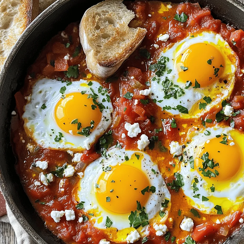 Nimm die Pfanne vom Herd. Bestreue die Shakshuka mit gehackter Petersilie. Wenn du magst, füge zerbröselten Feta hinzu. Serviere die Shakshuka heiß aus der Pfanne. Dazu passt krustiges Brot. Das Brot ist perfekt, um in die Sauce und die Eigelbe zu dippen. Ein leichter Schuss Olivenöl vor dem Servieren sorgt für einen schönen Glanz.