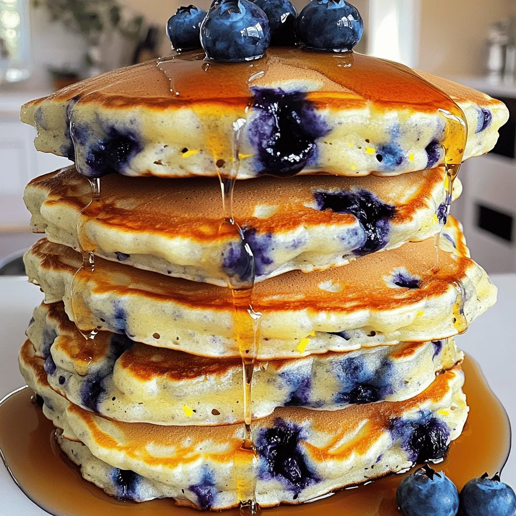Serviere die Pfannkuchen warm auf einem schönen Teller. Staple sie übereinander und füge einen Spritzer Zitronenschale hinzu. Ein Löffel frische Blaubeeren obenauf sieht toll aus. Ein leichtes Bestäuben mit Puderzucker sorgt für extra Süße. Ahornsirup passt perfekt dazu. Du kannst auch Joghurt oder Schlagsahne für einen cremigen Geschmack verwenden.