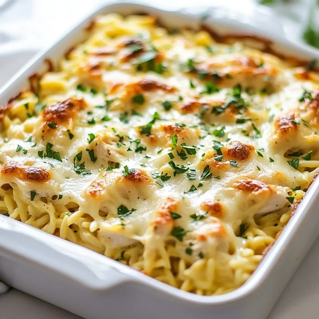 Ein köstlicher Auflauf mit Orzo-Pasta, zerkleinertem Hähnchen und karamellisierten Zwiebeln, überbacken mit Gruyère-Käse.