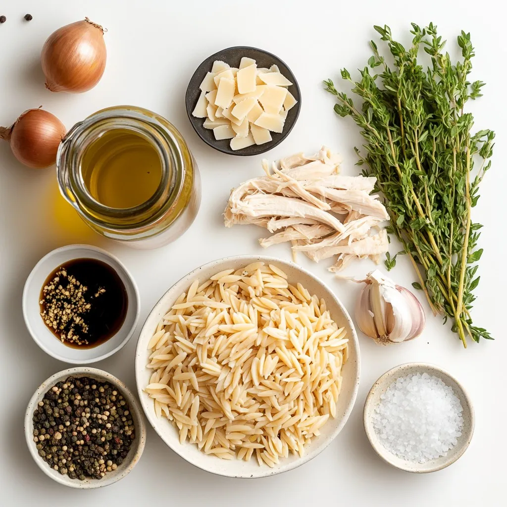 Ich liebe, wie einfach die Zutaten sind. Die Orzo-Pasta bringt eine tolle Textur. Die Zwiebel fügt Süße hinzu, wenn sie karamellisiert. Knoblauch bringt einen tollen Geschmack. Das zerkleinerte Hähnchen macht das Gericht sättigend. Hühnerbrühe hält alles saftig. Thymian und Rosmarin geben einen schönen Duft. Gruyère-Käse sorgt für cremige Köstlichkeit. Wenn du alle Zutaten hast, bist du bereit zu kochen.
