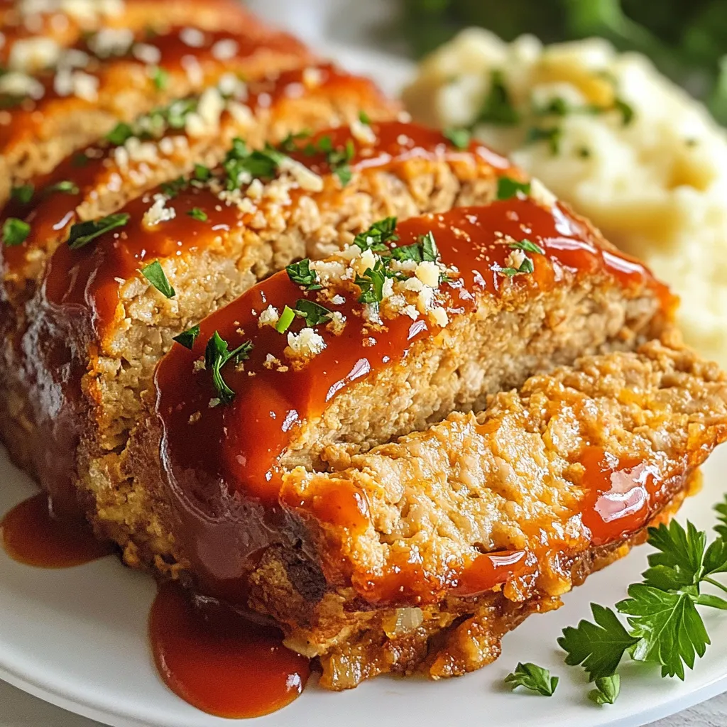 Ein saftiger Fleischlaib aus gemahlenem Hähnchen mit Knoblauch und Parmesan, perfekt für ein herzhaftes Abendessen.