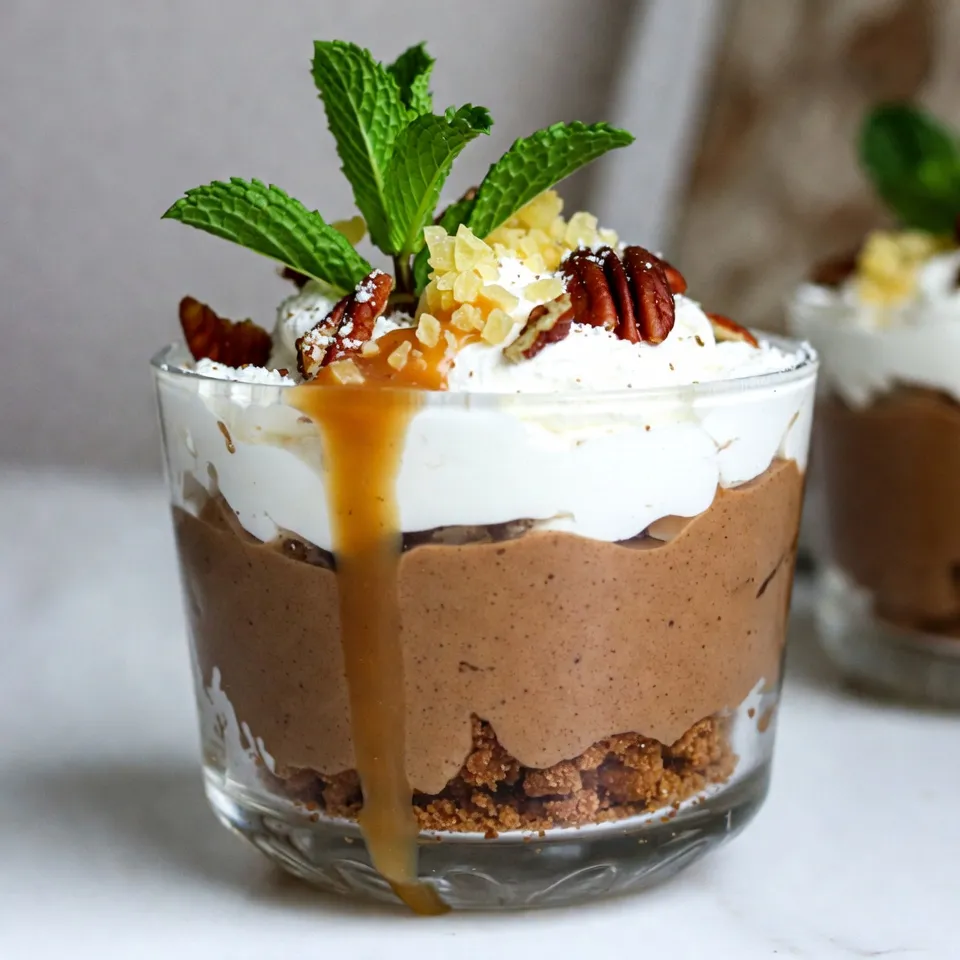 Für einen besonders festlichen Touch träufeln Sie etwas mehr Karamellsauce auf die oberste Schicht der Schlagsahne und garnieren Sie mit frischen Minzblättern und fein gehacktem kristallisierten Ingwer, falls gewünscht.