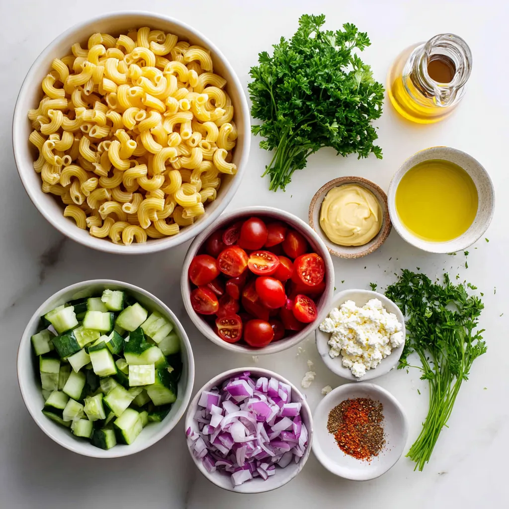 Um diesen leckeren Makkaroni-Salat zu machen, brauchen wir einige einfache Zutaten. Hier sind die Hauptzutaten: