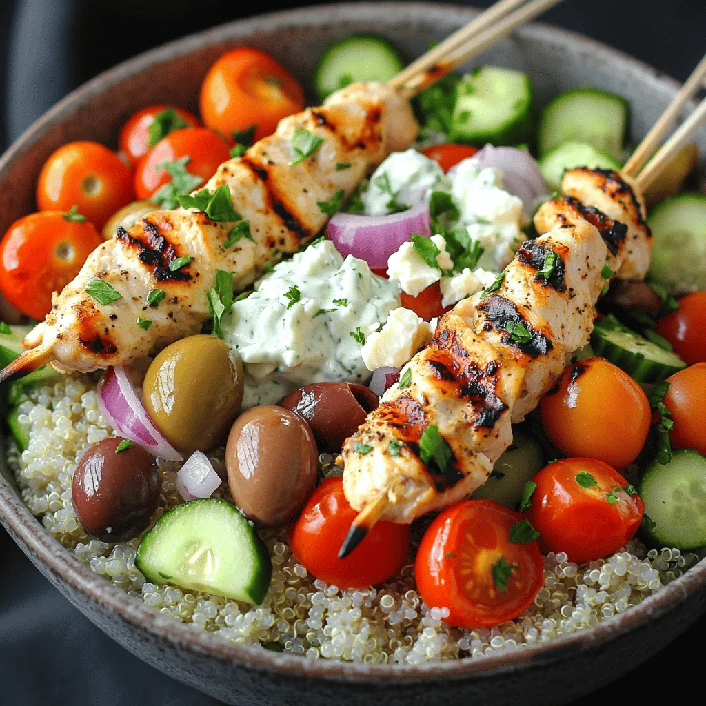 Die Präsentation macht viel aus! Beginne mit einer Schicht Quinoa oder Reis in der Schale. Füge dann die frischen Zutaten hinzu: Kirschtomaten, Gurke und rote Zwiebel. Die Oliven und der Feta kommen oben drauf. Das Hähnchen legt man zuletzt darauf. Beträufle alles mit Tzatziki und garniere mit frischer Petersilie. Nutze bunte Schalen oder ein hübsches Tablett. So wirkt dein Gericht einladend!