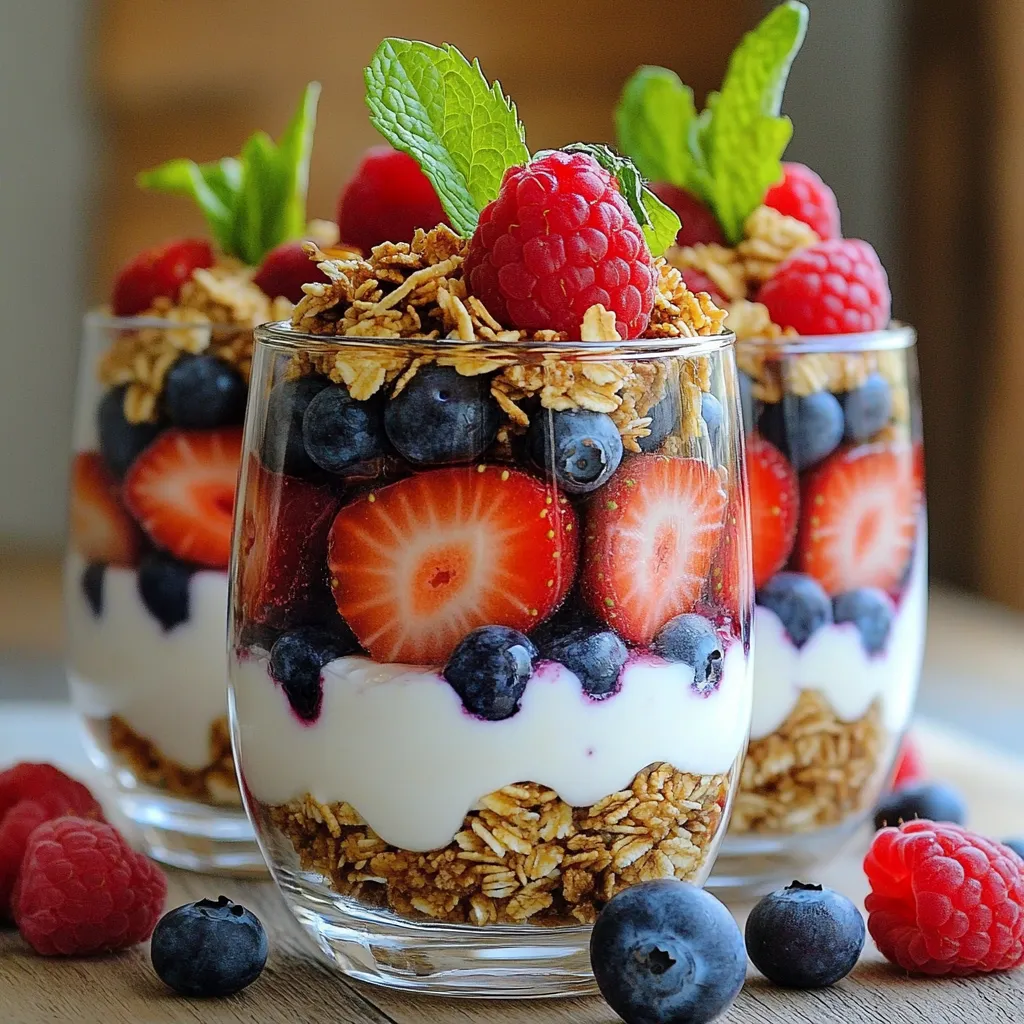 Nehmen Sie durchsichtige Gläser oder Parfait-Behälter. Beginnen Sie mit einer Schicht des gesüßten Joghurts. Verteilen Sie diese gleichmäßig am Boden. Fügen Sie dann eine Schicht gemischter Beeren hinzu. Streuen Sie eine großzügige Prise Granola darüber. Wiederholen Sie die Schichtung, bis die Gläser voll sind. Beenden Sie mit einer Schicht Joghurt oben. Garnieren Sie die Parfaits mit zusätzlichen Beeren und frischen Minzblättern. Genießen Sie die Parfaits sofort für den besten Geschmack und die beste Textur.