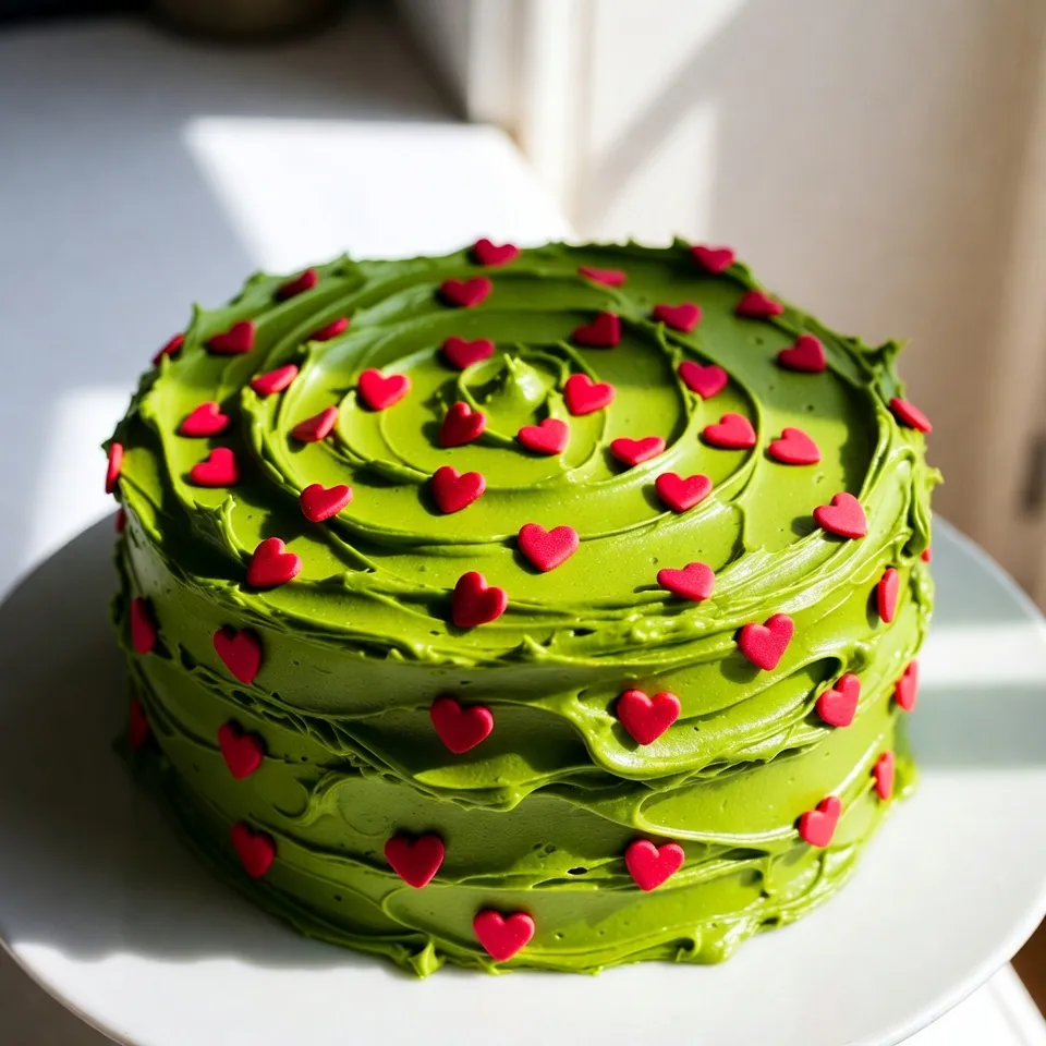 Ein festlicher Kuchen, der die grüne Farbe des Grinch widerspiegelt und mit rotem Zuckerkonfetti dekoriert ist.