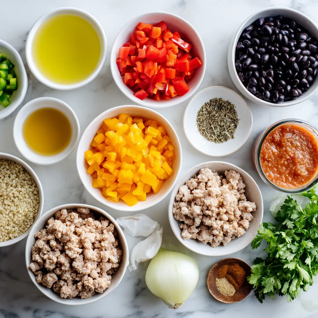 Für meine gefüllte Paprika-Suppe sind die Zutaten einfach. Ich wähle frische Paprika in verschiedenen Farben. Das macht die Suppe bunt und einladend. Mageres Puten- oder Rinderhackfleisch sorgt für viel Protein. Schwarze Bohnen bringen zusätzlichen Geschmack und Nährstoffe. Quinoa ist mein Geheimnis für mehr Fülle und einen guten Biss.