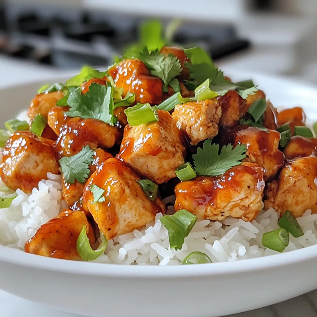 Ein köstliches und einfaches Gericht mit Hähnchen in einer süßen BBQ-Sauce, serviert auf einem Bett aus fluffigem Jasminreis.