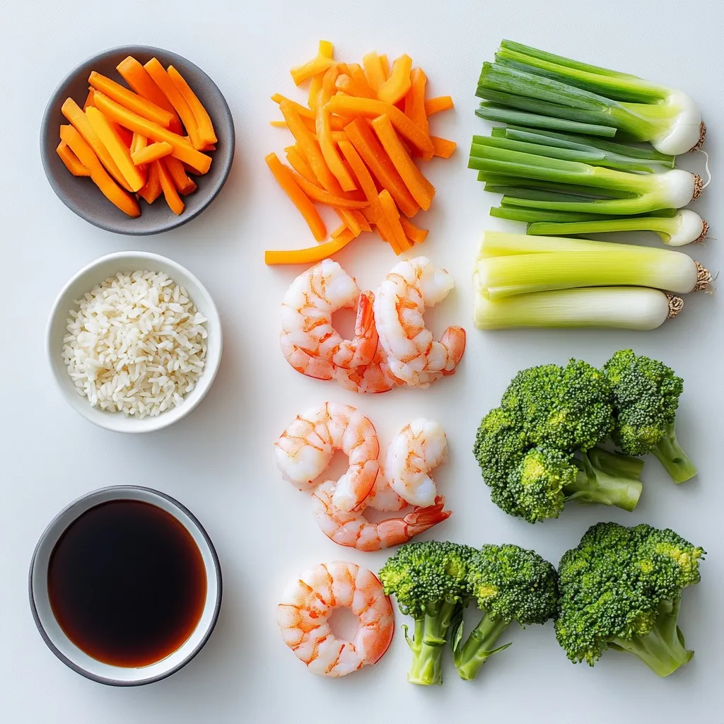 Die Zutaten sind einfach und frisch. Garnelen sind der Hauptstar dieses Gerichts. Sie bringen einen tollen Geschmack und eine schöne Textur. Jasminreis ist eine perfekte Beilage. Er ist leicht und duftet gut. Brokkoli gibt Farbe und Nährstoffe.