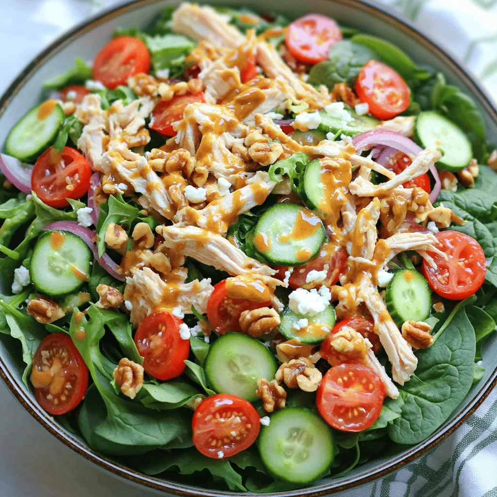 ![Für diesen leckeren Honig-Senf Hühnchensalat benötigst du einige frische Zutaten. Hier ist die Liste: - 2 Tassen gekochte Hähnchenbrust, zerkleinert - 4 Tassen gemischte Blattsalate (Spinat, Rucola und Romanasalat) - 1/2 Tasse Kirschtomaten, halbiert - 1/4 Tasse Gurke, dünn geschnitten - 1/4 rote Zwiebel, dünn geschnitten - 1/4 Tasse Walnüsse, grob gehackt - 1/4 Tasse Feta-Käse, zerbröselt Diese Zutaten sorgen für einen tollen Geschmack und eine schöne Farbe. Das zarte Hähnchen passt gut zu den knackigen Salaten. Die Kirschtomaten bringen Süße, während die Zwiebel eine leichte Schärfe hinzufügt. Die Walnüsse geben einen schönen Crunch. Das Dressing macht den Salat besonders. Hier sind die Zutaten dafür: - 1/4 Tasse Honig - 3 Esslöffel Dijon-Senf - 2 Esslöffel Zitronensaft - 1/4 Tasse Olivenöl - Salz und Pfeffer nach Geschmack Das Honig-Senf-Dressing ist süß und würzig zugleich. Es bringt alle Aromen im Salat zusammen. Es ist wichtig, die richtige Balance zwischen Süße und Säure zu finden. Frische Zutaten machen den Unterschied. Hier sind einige Tipps, um die besten auszuwählen: - Hähnchen: Achte darauf, dass das Hähnchen frisch aussieht und gut riecht. - Salate: Wähle Blätter, die knackig und grün sind. Vermeide welke oder gelbe Blätter. - Gemüse: Kirschtomaten sollten fest und glänzend sein. Gurken dürfen keine Druckstellen haben. - Nüsse: Kaufe Walnüsse in kleinen Mengen, damit sie frisch bleiben. - Käse: Achte auf frischen Feta-Käse. Er sollte gut riechen und eine cremige Textur haben. Indem du frische Zutaten wählst, machst du deinen Honig-Senf Hühnchensalat noch besser. Für das vollständige Rezept sieh dir die [Full Recipe] an. Um das Dressing zuzubereiten, nimm eine kleine Schüssel. Gib den Honig, Dijon-Senf und Zitronensaft hinein. Verwende einen Schneebesen, um alles gut zu vermischen. Das ist wichtig, damit die Aromen sich gut verbinden. Während du rührst, füge langsam das Olivenöl hinzu. Rühre weiter, bis die Mischung cremig und glatt ist. Schmecke mit Salz und Pfeffer ab. Das Dressing ist jetzt bereit. Nimm eine große Rührschüssel. Füge die gemischten Blattsalate hinzu. Danach kommt das zerkleinerte Hähnchen dazu. Halbiere die Kirschtomaten und schneide die Gurke in dünne Scheiben. Gib auch die rote Zwiebel und die Walnüsse in die Schüssel. Mische alles vorsichtig, damit die Zutaten nicht zerdrückt werden. Diese Mischung bringt frische und knusprige Aromen in den Salat. Jetzt ist es Zeit, den Salat anzurichten. Träufle das Honig-Senf-Dressing gleichmäßig über die Salatmischung. Rühre vorsichtig um, damit alles gut bedeckt ist. Füge den zerbröselten Feta-Käse hinzu. Mische ihn sanft unter, damit er nicht zerbricht. Portioniere den Salat auf Teller oder in Schalen. Du kannst nach Belieben zusätzliches Dressing darüber träufeln. Um den Salat schön zu präsentieren, streue ein paar Walnüsse und Feta darüber. Essbare Blumen machen den Salat noch bunter. Für das vollständige Rezept schaue auf den Abschnitt „Full Recipe“. Du kannst diesen Salat leicht im Voraus zubereiten. Koche das Hähnchen und lasse es abkühlen. Zerkleinere es dann und bewahre es in einem luftdichten Behälter auf. Das Dressing kannst du ebenfalls vorbereiten. Mische Honig, Senf und Zitronensaft. Füge das Olivenöl langsam hinzu und rühre gut. Das Dressing hält sich bis zu einer Woche im Kühlschrank. So sparst du Zeit, wenn du den Salat servieren willst. Ein häufiger Fehler ist, das Dressing zu früh hinzuzufügen. Das kann den Salat matschig machen. Mische das Dressing erst kurz vor dem Servieren unter. Auch bei den Zutaten ist es wichtig, frische Produkte zu wählen. Vermeide welke Blätter oder schlaffe Tomaten. Diese beeinträchtigen den Geschmack und die Textur des Salats. Die richtige Konsistenz des Dressings ist entscheidend. Es sollte cremig, aber nicht zu dick sein. Achte darauf, das Olivenöl langsam hinzuzufügen. So emulgiert das Dressing besser. Wenn es zu dick wird, kannst du einen kleinen Spritzer Wasser oder Zitronensaft hinzufügen. Rühre gut um, bis die gewünschte Konsistenz erreicht ist. Das Dressing sollte leicht über die Zutaten gleiten, ohne sie zu ertränken. {{image_4}} Wenn du deinen Honig-Senf Hühnchensalat aufpeppen möchtest, denke an verschiedene Zutaten. Obst bringt Frische und Süße. Du kannst Äpfel, Trauben oder Beeren verwenden. Sie passen gut zum Hähnchen und dem Dressing. Nüsse wie Mandeln oder Pekannüsse bieten einen schönen Crunch. Sie sorgen für mehr Textur und Geschmack. Experimentiere mit verschiedenen Kombinationen. Deine Gäste werden begeistert sein von den neuen Aromen! Das Honig-Senf-Dressing ist lecker, aber du kannst auch andere Dressings testen. Ein Joghurt-Dressing macht den Salat cremiger. Ein Zitronen-Vinaigrette bringt Frische. Du kannst auch ein BBQ-Dressing verwenden, um einen rauchigen Geschmack hinzuzufügen. Probiere verschiedene Dressings und finde deinen Favoriten. So bleibt der Salat spannend und abwechslungsreich. Für glutenfreie Optionen, stelle sicher, dass alle Zutaten glutenfrei sind. Das Hähnchen kann durch Kichererbsen oder Tofu ersetzt werden. Diese Alternativen sorgen für Protein und viele Nährstoffe. Vegetarier können den Feta-Käse durch eine pflanzliche Variante ersetzen. Die Salatbasis bleibt gleich und bleibt somit frisch und lecker. So kann jeder den Salat genießen! Für das gesamte Rezept kannst du [Full Recipe] anschauen. Um den Honig-Senf Hühnchensalat frisch zu halten, bewahre ihn in einem luftdichten Behälter auf. Das schützt ihn vor Luft und Feuchtigkeit. Stelle sicher, dass der Salat gut abgedeckt ist. Du kannst ihn auch in Portionen aufteilen, um ihn einfacher zu genießen. Im Kühlschrank hält sich der Salat bis zu drei Tage. Achte darauf, dass die Zutaten frisch sind, bevor du den Salat zubereitest. Wenn der Salat unangenehm riecht oder die Textur sich verändert, solltest du ihn wegwerfen. Einige Zutaten lassen sich gut 