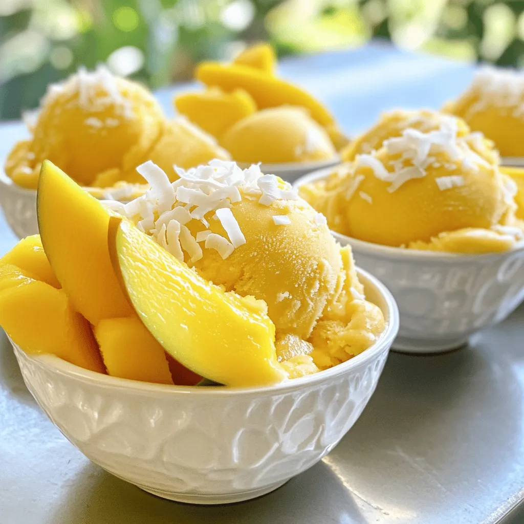 Für das beste Mango Sorbet sind die Hauptzutaten entscheidend. Die Mangos sollten reif sein, damit sie süß und saftig sind. Ich empfehle, die Mangos gut zu prüfen. Ein leichtes Drücken zeigt, ob sie reif sind. Die Kokosmilch sorgt für eine cremige Textur. Sie bringt auch einen leichten, tropischen Geschmack. Der Zucker ist wichtig, um die Süße auszubalancieren. Überprüfen Sie die Süße der Mangos, um den Zuckergehalt anzupassen.