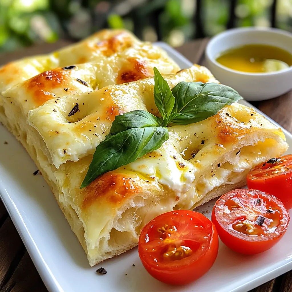 Servieren Sie die Focaccia-Sandwiches auf einem Holzbrett, in Stücke geschnitten, dekoriert mit extra Basilikumblättern und einer kleinen Schale mit Olivenöl zum Dippen.