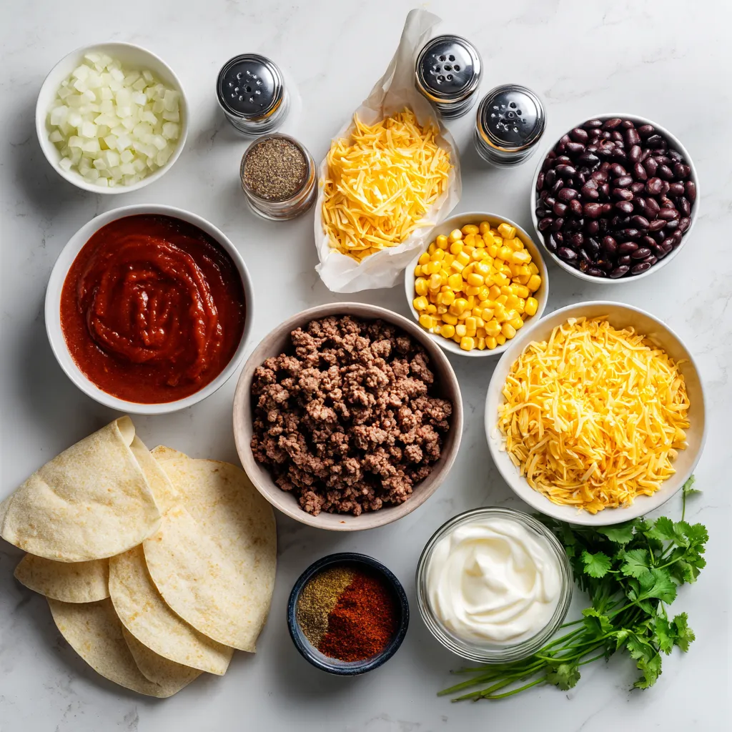 Die Hauptzutaten sind wichtig für den Geschmack der Enchiladas. Rinderhackfleisch bringt die nötige Fülle. Zwiebel und Knoblauch geben eine schöne Basis. Schwarze Bohnen und Mais sorgen für Textur und Süße.