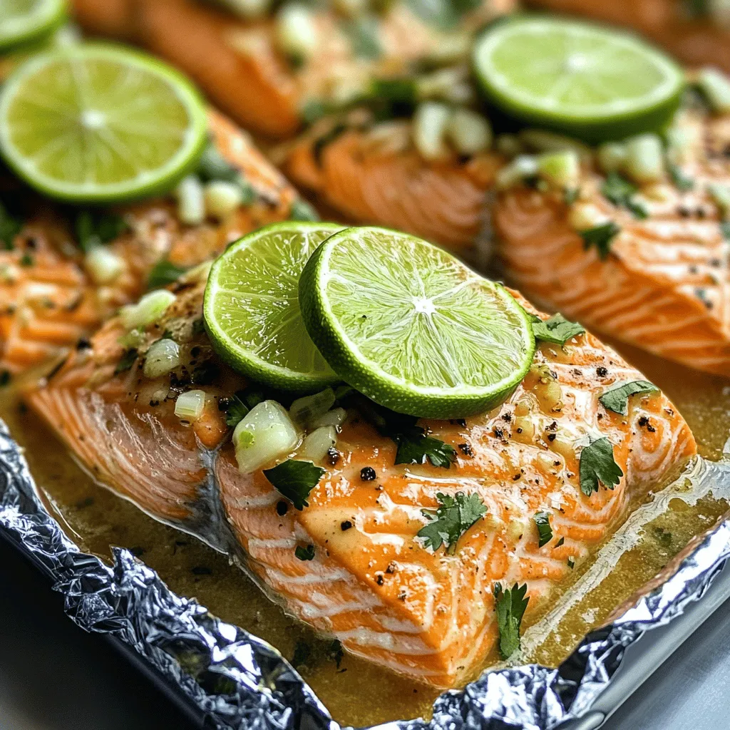 Die Zutaten für die Knoblauchbutter Limette Koriander Lachs-Pakete sind einfach und frisch. Der Lachs ist der Hauptbestandteil. Er bietet eine tolle Basis für den Geschmack. Die ungesalzene Butter sorgt für einen reichhaltigen, cremigen Geschmack. Knoblauch bringt ein starkes Aroma mit. Limetten fügen eine spritzige Frische hinzu. Frischer Koriander bringt eine grüne Note.