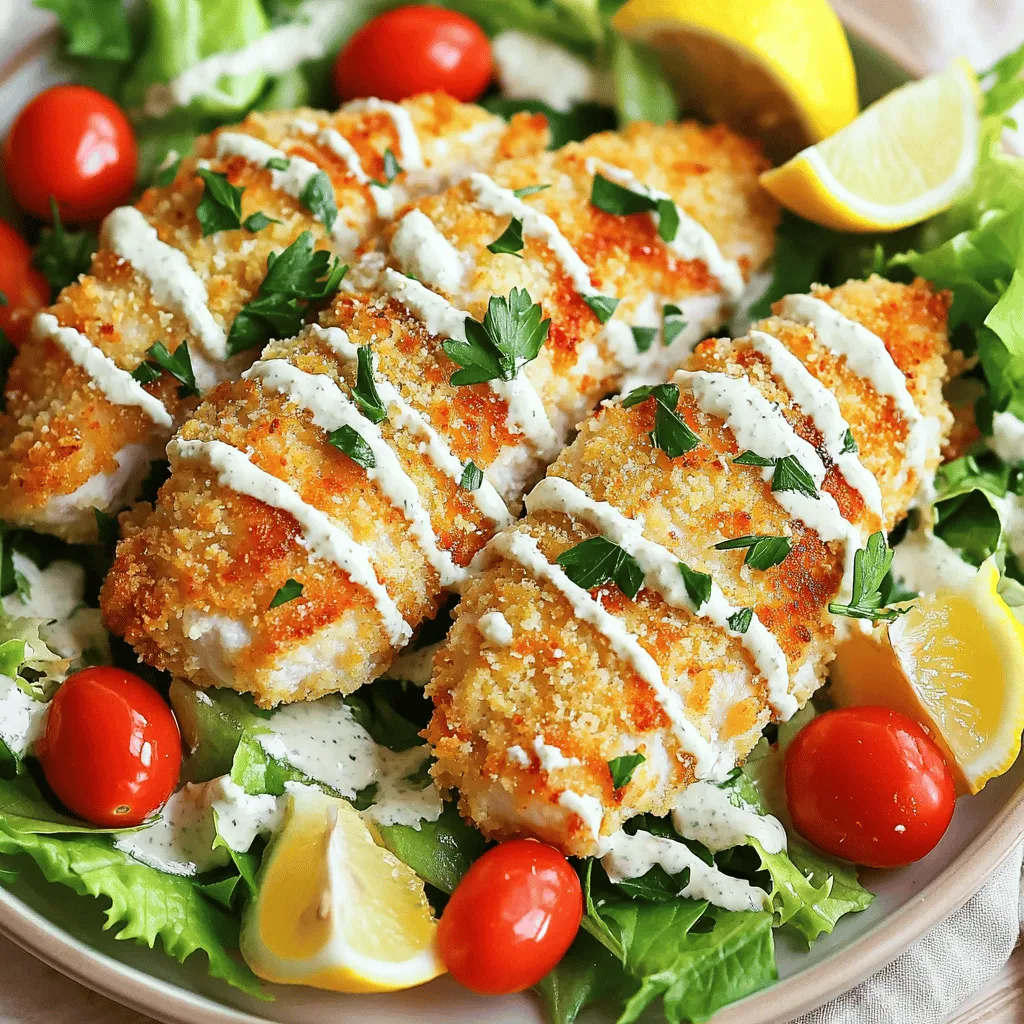 ![- 2 Hühnerbrustfilets ohne Knochen und Haut - 1 Tasse Paniermehl (Panko für extra Knusprigkeit) - 1/2 Tasse geriebener Parmesan - 2 Tassen Romanasalat, grob gehackt - 1/2 Tasse Cherry-Tomaten, halbiert - 1/4 Tasse Caesar-Dressing (fertig gekauft oder selbstgemacht) Die Hauptzutaten sind einfach zu finden und bieten einen tollen Geschmack. Die Hühnerbrustfilets machen das Gericht proteinreich. Panko sorgt für eine extra knusprige Kruste. Parmesan gibt einen herzhaften, salzigen Geschmack. Romanasalat sorgt für frische, während Cherry-Tomaten eine süße Note hinzufügen. - 1 Teelöffel Knoblauchpulver - 1 Teelöffel Zwiebelpulver - Salz und Pfeffer nach Geschmack Die Gewürze sind wichtig für den Geschmack des Hähnchens. Knoblauchpulver und Zwiebelpulver geben Aroma. Salz und Pfeffer runden das Gericht ab. Sie können die Menge nach Ihrem Geschmack anpassen. - Frische Petersilie, gehackt zum Garnieren - Zitronenschnitze zum Servieren Die Garnierungen machen den Salat spannend. Petersilie bringt Farbe ins Spiel und einen frischen Geschmack. Zitronenschnitze helfen, das Gericht aufzupeppen. Ein Spritzer Zitrone kann die Aromen verstärken. Für das gesamte Rezept besuchen Sie bitte [Full Recipe]. Heize den Ofen auf 200 °C vor. Lege ein Backblech mit Backpapier aus. Das Backpapier hilft, das Hähnchen knusprig zu machen. Bereite die Paniermehlmischung vor. Vermenge das Panko, den Parmesan, das Knoblauchpulver, das Zwiebelpulver, Salz und Pfeffer in einer flachen Schüssel. Das gibt dem Hähnchen einen tollen Geschmack. Tupfe die Hühnerbrustfilets mit Küchenpapier trocken. Tauche jedes Filet in die Mischung und drücke leicht, damit die Panade gut haftet. Lege die panierten Hühnerbrustfilets auf das Backblech. Backe sie 25 bis 30 Minuten. Achte darauf, dass das Hähnchen eine Innentemperatur von 74 °C erreicht. So wird es perfekt durchgegart und knusprig. Während das Hähnchen im Ofen ist, bereite den Salat vor. Nimm eine große Schüssel und kombiniere den grob gehackten Romanasalat mit den halbierten Cherry-Tomaten. Füge das Caesar-Dressing hinzu. Mische alles gut durch, bis der Salat gleichmäßig bedeckt ist. Wenn das Hähnchen gar ist, nimm es aus dem Ofen und lass es 5 Minuten ruhen. Schneide das Hähnchen in Streifen. Garniere den Salat mit den knusprigen Hähnchenstreifen. Streue nach Belieben zusätzlichen Parmesan darüber. Dekoriere den Salat mit gehackter Petersilie und serviere Zitronenschnitze dazu. Das macht das Gericht frisch und lecker. Für das vollständige Rezept schau dir die [Full Recipe] an. Um das Hähnchen richtig knusprig zu machen, folgen Sie diesen Tipps: - Wählen Sie die richtige Panade: Verwenden Sie Panko für extra Knusprigkeit. Es sorgt für eine luftige Textur. - Trocknen Sie das Hähnchen: Tupfen Sie die Hühnerbrustfilets gut mit Küchenpapier trocken. Das hilft der Panade, besser zu haften. - Doppelte Panade: Tauchen Sie das Hähnchen zuerst in das Ei und dann in die Paniermehlmischung. So wird die Hülle dicker und knuspriger. - Backtemperatur: Stellen Sie Ihren Ofen auf 200 °C ein. Diese Temperatur sorgt für eine goldene Farbe und eine knusprige Kruste. - Nicht überfüllen: Legen Sie die Filets mit Abstand auf das Backblech. So kann die Luft zirkulieren und das Hähnchen wird gleichmäßig knusprig. Damit der Salat frisch bleibt, beachten Sie diese Vorschläge: - Zutaten getrennt lagern: Lagern Sie den Romanasalat und die Tomaten in separaten Behältern. So bleibt alles knackig. - Dressings erst kurz vor dem Servieren hinzufügen: Geben Sie das Dressing erst kurz vor dem Essen auf den Salat. So wird er nicht matschig. - Verwenden Sie frische Zutaten: Achten Sie darauf, frische und knackige Salatzutaten zu verwenden. Dies verbessert den Geschmack und die Optik. Hausgemachte Dressings bringen Geschmack und Frische. Hier sind einige einfache Ideen: - Klassisches Caesar-Dressing: Mischen Sie Mayonnaise, Zitronensaft, Knoblauch, Worcestershire-Sauce und Parmesan. Das ist einfach und lecker. - Joghurt-Dressing: Für eine leichtere Variante, verwenden Sie griechischen Joghurt statt Mayonnaise. Es gibt dem Salat einen frischen Kick. - Beilagen: Servieren Sie das Gericht mit knusprigem Brot oder einem frischen Baguette. Es ergänzt den Salat perfekt und sorgt für ein rundes Essen. Mit diesen Tipps und Tricks wird Ihr Chicken Caesar Salad mit leckerem Hähnchen ein Hit! Für die vollständige Zubereitung, schauen Sie sich das [Full Recipe] an. {{image_4}} Wenn Sie kein Huhn mögen oder einfach eine fleischfreie Option suchen, probieren Sie gebackenen Tofu. Er hat eine tolle Textur und nimmt den Geschmack gut auf. Schneiden Sie den Tofu in Würfel und marinieren Sie ihn mit Sojasauce, Knoblauch und Ingwer. Panieren Sie ihn dann wie das Hähnchen. Backen Sie ihn bis er goldbraun ist, ähnlich wie bei der Hühnerbrust. Für eine leichtere Version des Dressings können Sie griechischen Joghurt verwenden. Mischen Sie ihn mit Zitronensaft, Knoblauch und etwas Senf. Diese Mischung hat weniger Kalorien, bietet aber viel Geschmack. Sie könnten auch eine Vinaigrette auf Basis von Olivenöl und Balsamico probieren. Sie bringt frische Aromen und ist ebenfalls kalorienfreundlich. Fühlen Sie sich frei, den Salat mit mehr Gemüse zu erweitern. Geben Sie Gurken, Avocado oder sogar gebratene Paprika hinzu. Auch verschiedene Käsesorten können den Geschmack verändern. Feta oder Mozzarella passen gut und sorgen für einen neuen Twist. Experimentieren Sie mit den Zutaten, um Ihren perfekten Salat zu finden. Für das vollständige Rezept besuchen Sie [Full Recipe]. Um den Salat und das Dressing frisch zu halten, lagern Sie sie getrennt. Das verhindert, dass der Salat matschig wird. Füllen Sie den Salat in einen luftdichten Behälter. Das Dressing kann in einem kleinen Glas oder einer Flasche aufbewahrt werden. Achten Sie darauf, dass der Behälter gut verschlossen ist. So bleibt der Salat knackig und das Dressing cremig. Im Kühlschrank bleibt der Salat bis 