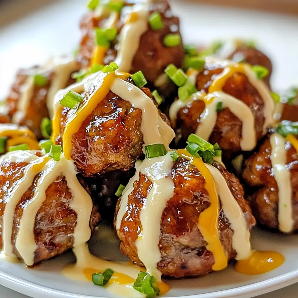 Die Fleischbällchen heiß servieren, mit der scharfen Mayonnaise beträufeln und nach Wunsch mit zusätzlichen, in Ringe geschnittenen Frühlingszwiebeln garnieren.
