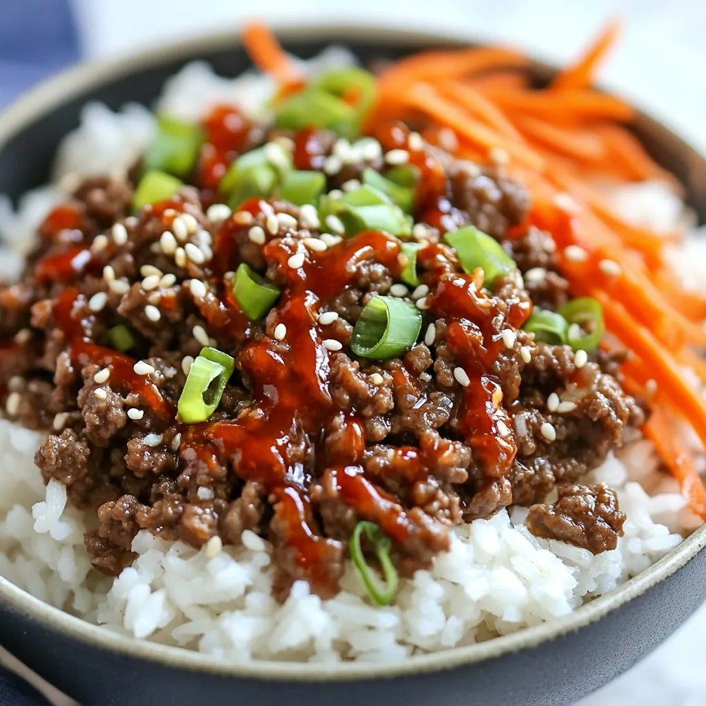 Verteile die Rinderhackmischung großzügig auf Schalen mit gekochtem Reis. Garniere jede Schale mit den grünen Frühlingszwiebeln und Sesamsamen. Wenn du es schärfer magst, träufle Sriracha darüber.