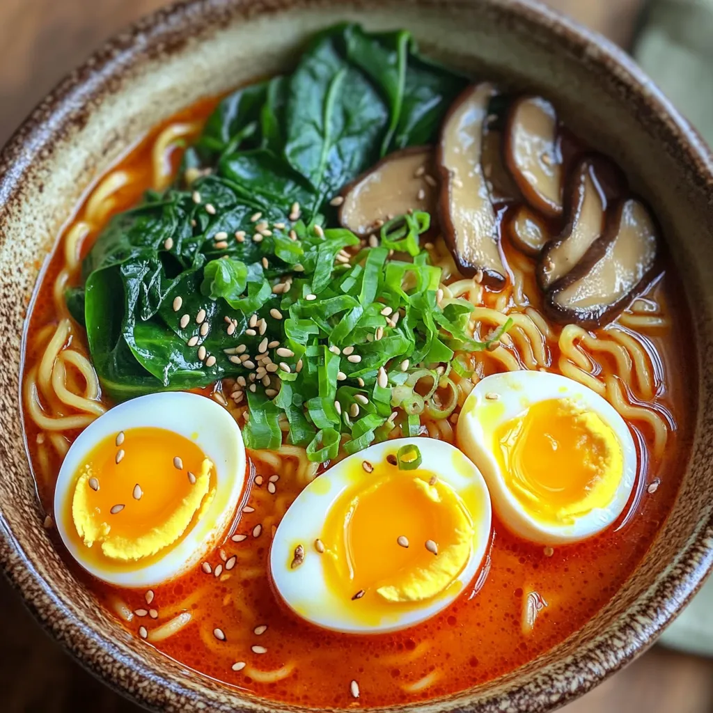 Verteile die Ramen-Suppe gleichmäßig auf zwei Servierbowls. Achte darauf, dass Pilze und Spinat gleichmäßig verteilt sind. Halbiere die weichgekochten Eier und lege sie auf die Ramen. Toppe das Gericht mit gehackten Frühlingszwiebeln und optional mit Sesamkörnern. Jetzt ist dein Gericht bereit zum Genießen!