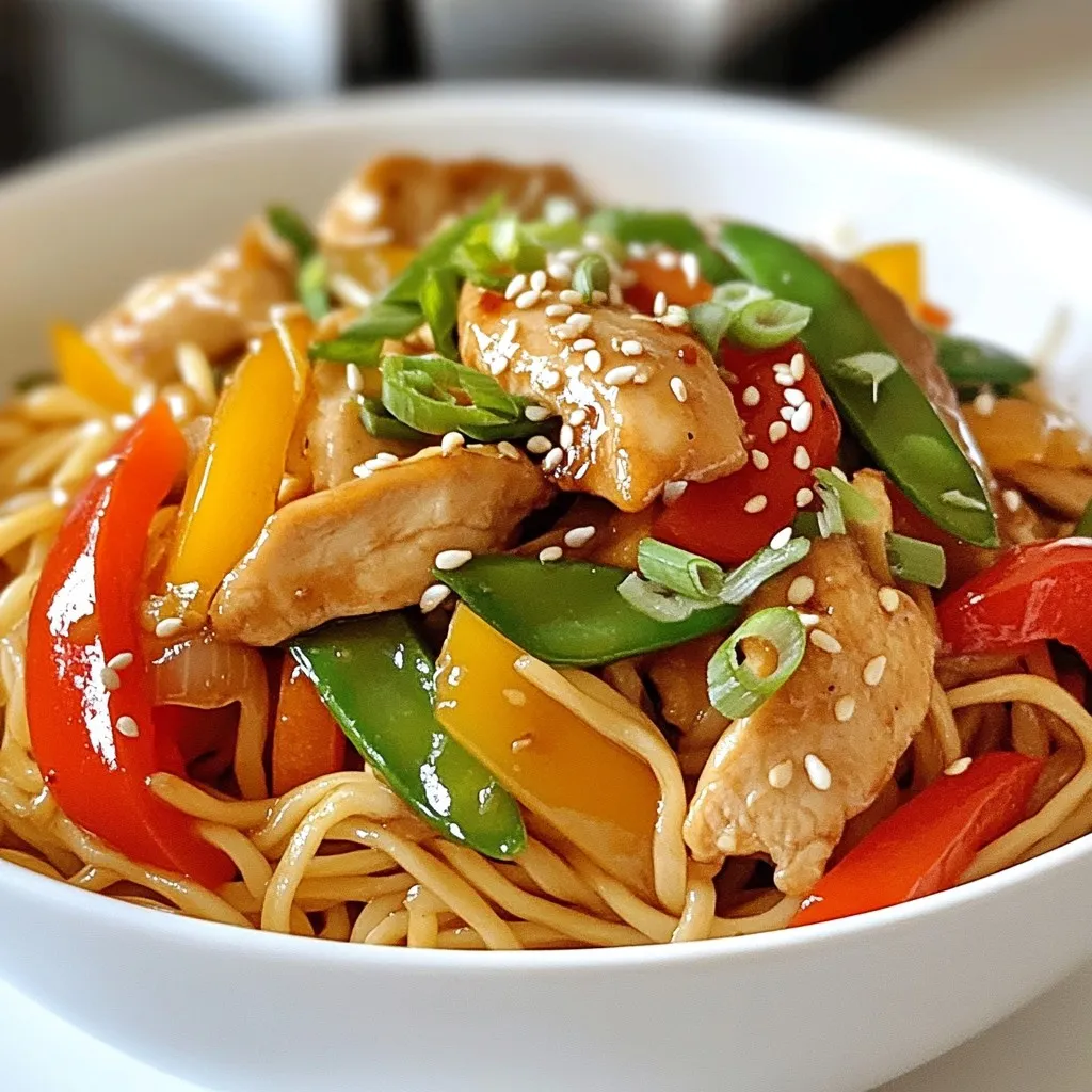 Ein köstliches und schnelles Gericht mit Hähnchen und frischem Gemüse, serviert mit Chow Mein Nudeln.