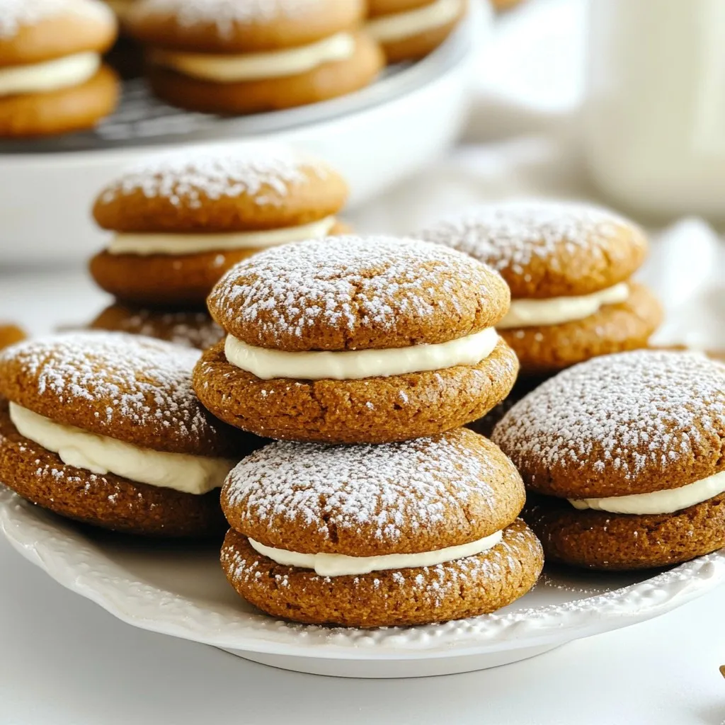 Bestäuben Sie die fertigen Whoopie Pies leicht mit Puderzucker und servieren Sie sie auf einem festlichen Tablett – perfekt für Feiertagsfeiern!