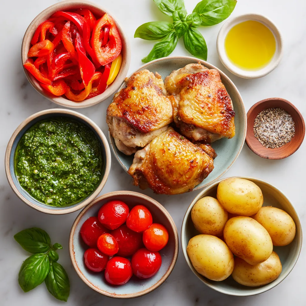 Hauptzutaten für Blechofen-Pesto-Hühnchenkeulen