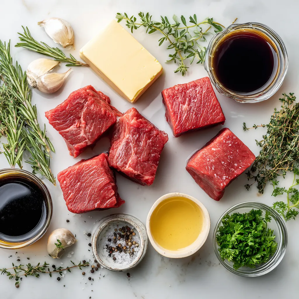 Die Zutaten für meine Slow Cooker Garlic Butter Beef Bites sind einfach, aber voller Geschmack. Beginnen wir mit dem Rindfleisch. Sirloin ist perfekt, weil es zart und saftig ist. Das macht die Bissen besonders lecker.